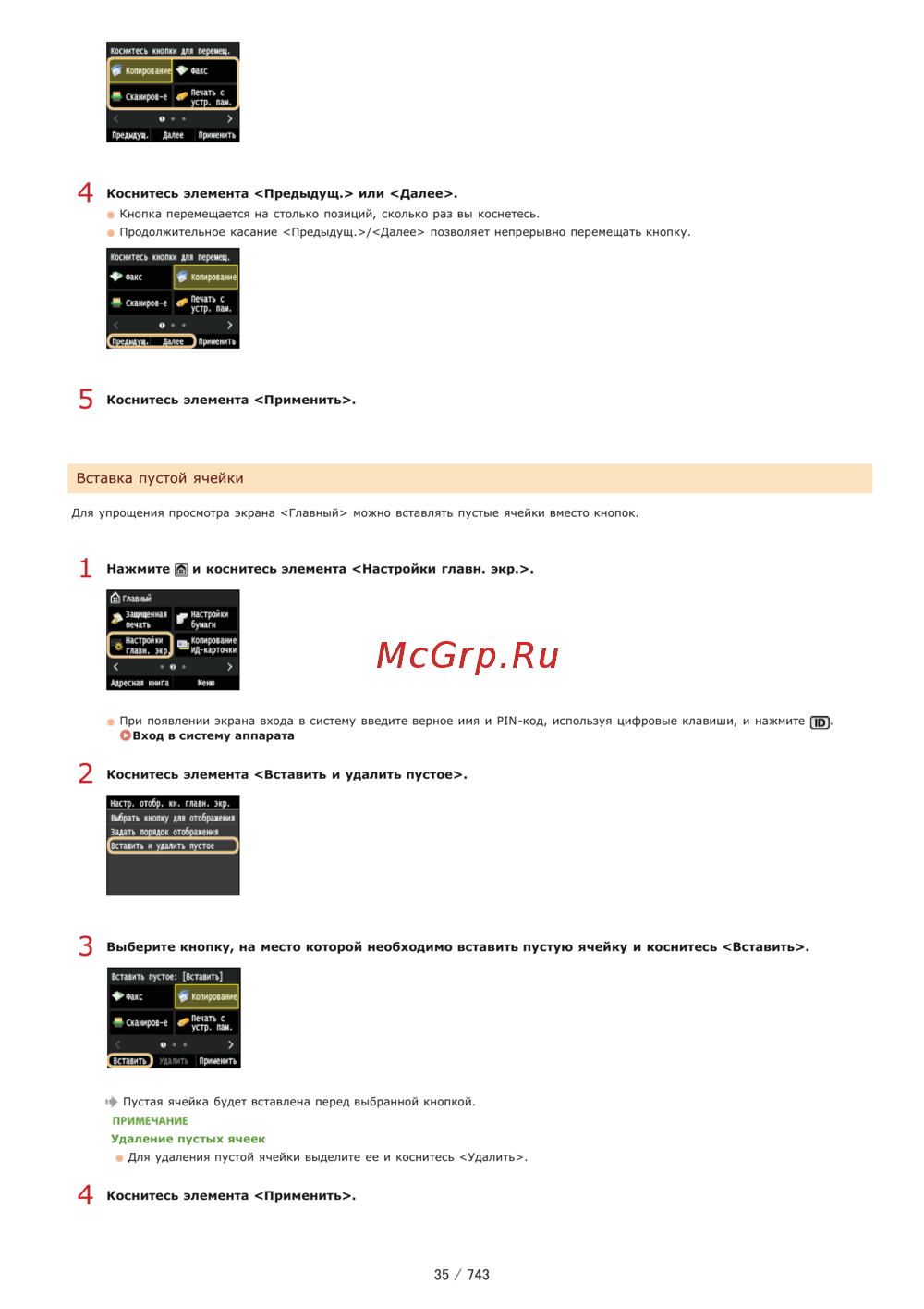 Коснитесь элемента Предыдущ или Далее Кнопка перемещается на столько позиций сколько раз вы коснетесь Продолжительное касание Предыдущ Далее позволяет непрерывно перемещать кнопку 5 Коснитесь элемента Применить Вставка пустой ячейки Для упрощения просмотра экрана Главный можно вставлять пустые ячейки вместо кнопок 1 Нажмите Щ и коснитесь элемента Настройки главн экр I fib главный заиииенна я л настройки и печать г настройки бумаги 1 щ копирование gj ид карточки главн эк о Адресная книга меню При появлении экрана входа в систему введите верное имя и PIN код используя цифровые клавиши и нажмите QD О Вход в систему аппарата Коснитесь элемента Вставить и удалить пустое Выберите кнопку на место которой необходимо вставить пустую ячейку и коснитесь Вставить вставить пустое вставить ц копмр влние Фаис сижрм е ____ о Удалить Применить Пустая ячейка будет вставлена перед выбранной кнопкой ПРИМЕЧАНИЕ Удаление пустых ячеек Для удаления пустой ячейки выделите ее и коснитесь Удалить Коснитесь элемента Применить 35 743