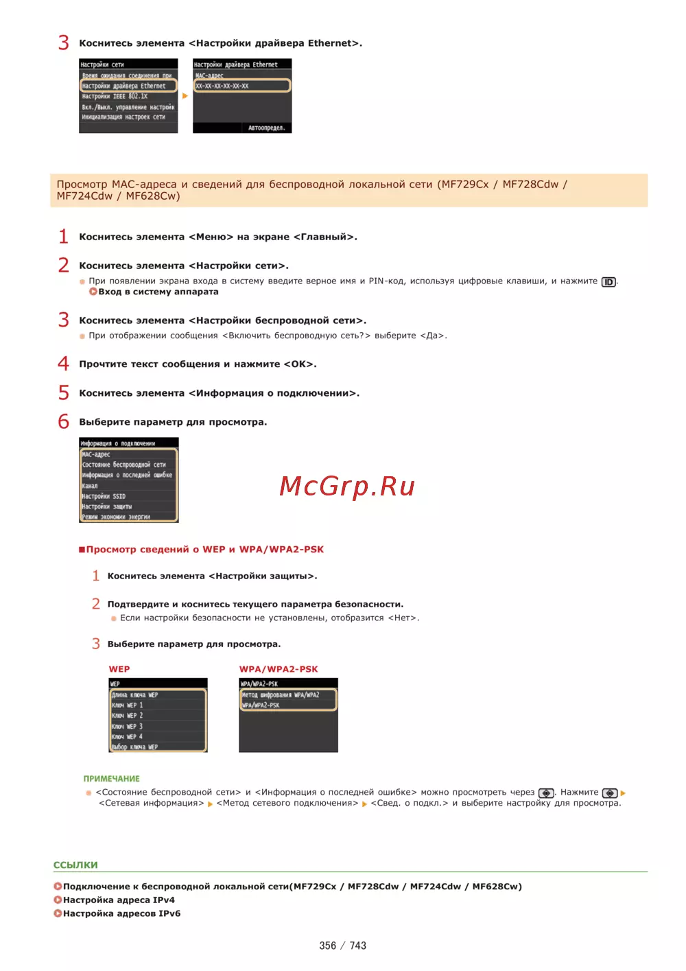 Коснитесь элемента Настройки драйвера Ethernet Просмотр МАС адреса и сведений для беспроводной локальной сети MF729CX MF728Cdw MF724Cdw MF628CW 1 2 Коснитесь элемента Меню на экране Главный Коснитесь элемента Настройки сети в При появлении экрана входа в систему введите верное имя и PIN код используя цифровые клавиши и нажмите jp О Вход в систему аппарата 3 Коснитесь элемента Настройки беспроводной сети При отображении сообщения Включить беспроводную сеть выберите Да 4 5 6 Прочтите текст сообщения и нажмите ОК Коснитесь элемента Информация о подключении Выберите параметр для просмотра Просмотр сведений о WEP и WPA WPA2 PSK 1 Коснитесь элемента Настройки защиты 2 Подтвердите и коснитесь текущего параметра безопасности Если настройки безопасности не установлены отобразится Нет 3 Выберите параметр для просмотра WEP WPA WPA2 PSK WEP длина клича ЕР клоч ШЕР 1 клад ШЕР 2 к юч ШЕР 3 кчоч ШЕР 4 рыбор ключа WEP ПРИМЕЧАНИЕ Состояние беспроводной сети и Информация о последней ошибке можно просмотреть через ф Нажмите Сетевая информация Метод сетевого подключения сСвед о подкл и выберите настройку для просмотра ССЫЛКИ ОПодключение к беспроводной локальной сети МР729Сх MF728Cdw MF724Cdw MF628Cw ОНастройка адреса IPv4 ОНастройка адресов IPv6 356 743