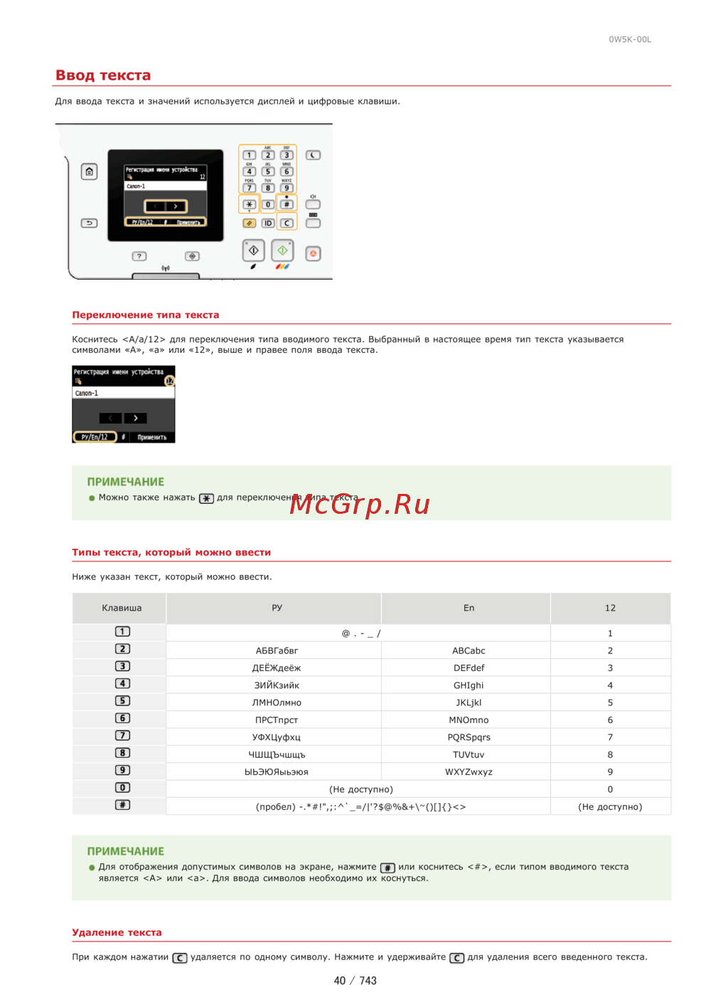 0W5K 00L Ввод текста Для ввода текста и значений используется дисплей и цифровые клавиши Переключение типа текста Коснитесь А а 12 для переключения типа вводимого текста Выбранный в настоящее время тип текста указывается символами А а или 12 выше и правее поля ввода текста ПРИМЕЧАНИЕ Можно также нажать для переключения типа текста Типы текста который можно ввести Ниже указан текст который можно ввести Клавиша РУ Еп 12 СЕ СЕ СЕ и СЕ СЕ СЕ СЕ СЕ СЕ СЕ 1 АБВГабвг АВСаЬс ДЕЁЖдеёж СЕЕбеГ 3 ЗИЙКзийк 6Н1дЫ 4 ЛМНОлмно 1КЦк1 5 ПРСТпрст ММОтпо 6 УФХЦуфхц РОКЗрцгБ 7 ЧШЩЪчшщъ 2 ТГМиу ЫЬЭЮЯыьэюя 8 WXYZwxyz 9 Не доступно пробел А _ Г О Недоступно ПРИМЕЧАНИЕ Для отображения допустимых символов на экране нажмите или коснитесь если типом вводимого текста является А или а Для ввода символов необходимо их коснуться Удаление текста При каждом нажатии с 1 удаляется по одному символу Нажмите и удерживайте С для удаления всего введенного текста 40 743