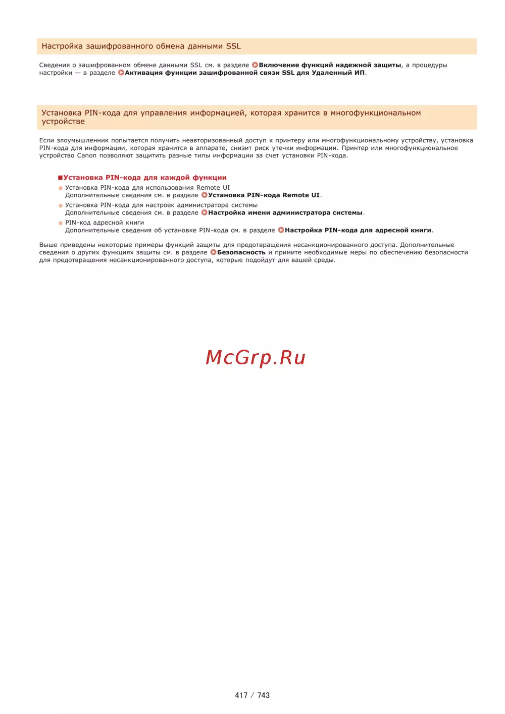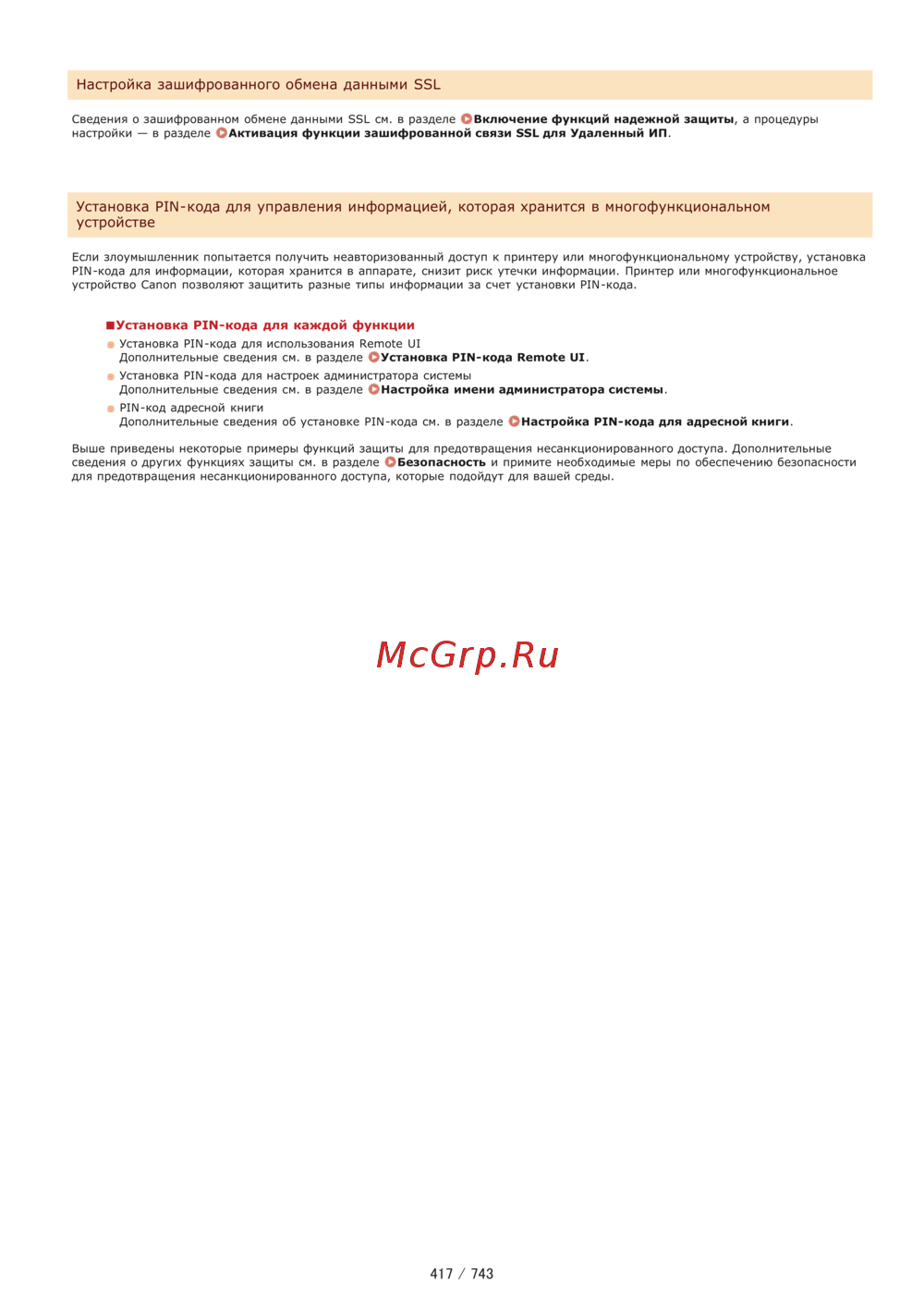 Настройка зашифрованного обмена данными SSL Сведения о зашифрованном обмене данными SSL см в разделе О Включение функций надежной защиты а процедуры настройки в разделе ОАктивация функции зашифрованной связи SSL для Удаленный ИП Установка PIN кода для управления информацией которая хранится в многофункциональном устройстве Если злоумышленник попытается получить неавторизованный доступ к принтеру или многофункциональному устройству установка PIN кода для информации которая хранится в аппарате снизит риск утечки информации Принтер или многофункциональное устройство Canon позволяют защитить разные типы информации за счет установки PIN кода Установка PIN кода для каждой функции Установка PIN кода для использования Remote UI Дополнительные сведения см в разделе ОУстановка PIN кода Remote UI Установка PIN кода для настроек администратора системы Дополнительные сведения см в разделе ОНастройка имени администратора системы PIN код адресной книги Дополнительные сведения об установке PIN кода см в разделе ОНастройка PIN кода для адресной книги Выше приведены некоторые примеры функций защиты для предотвращения несанкционированного доступа Дополнительные сведения о других функциях защиты см в разделе С Безопасность и примите необходимые меры по обеспечению безопасности для предотвращения несанкционированного доступа которые подойдут для вашей среды 417 743