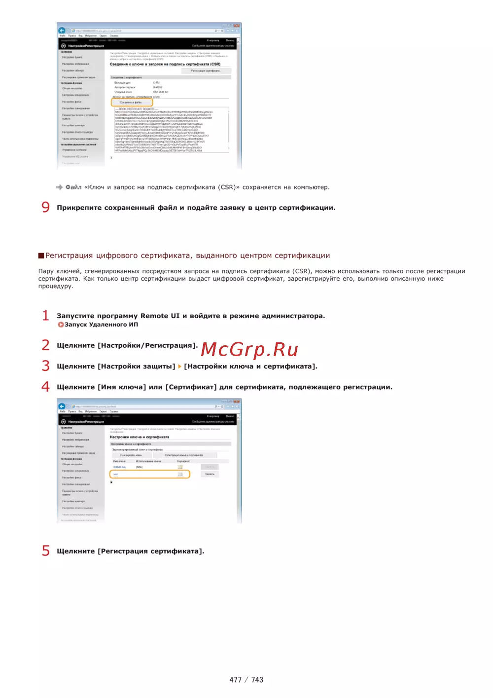 4 Файл Ключ и запрос на подпись сертификата СБК сохраняется на компьютер 9 Прикрепите сохраненный файл и подайте заявку в центр сертификации Регистрация цифрового сертификата выданного центром сертификации Пару ключей сгенерированных посредством запроса на подпись сертификата СБК можно использовать только после регистрации сертификата Как только центр сертификации выдаст цифровой сертификат зарегистрируйте его выполнив описанную ниже процедуру Запустите программу Remote UI и войдите в режиме администратора С Запуск Удаленного ИП 2 3 4 5 Щелкните Настройки Регистрация Щелкните Настройки защиты К Настройки ключа и сертификата Щелкните Имя ключа или Сертификат для сертификата подлежащего регистрации Щелкните Регистрация сертификата 477 743