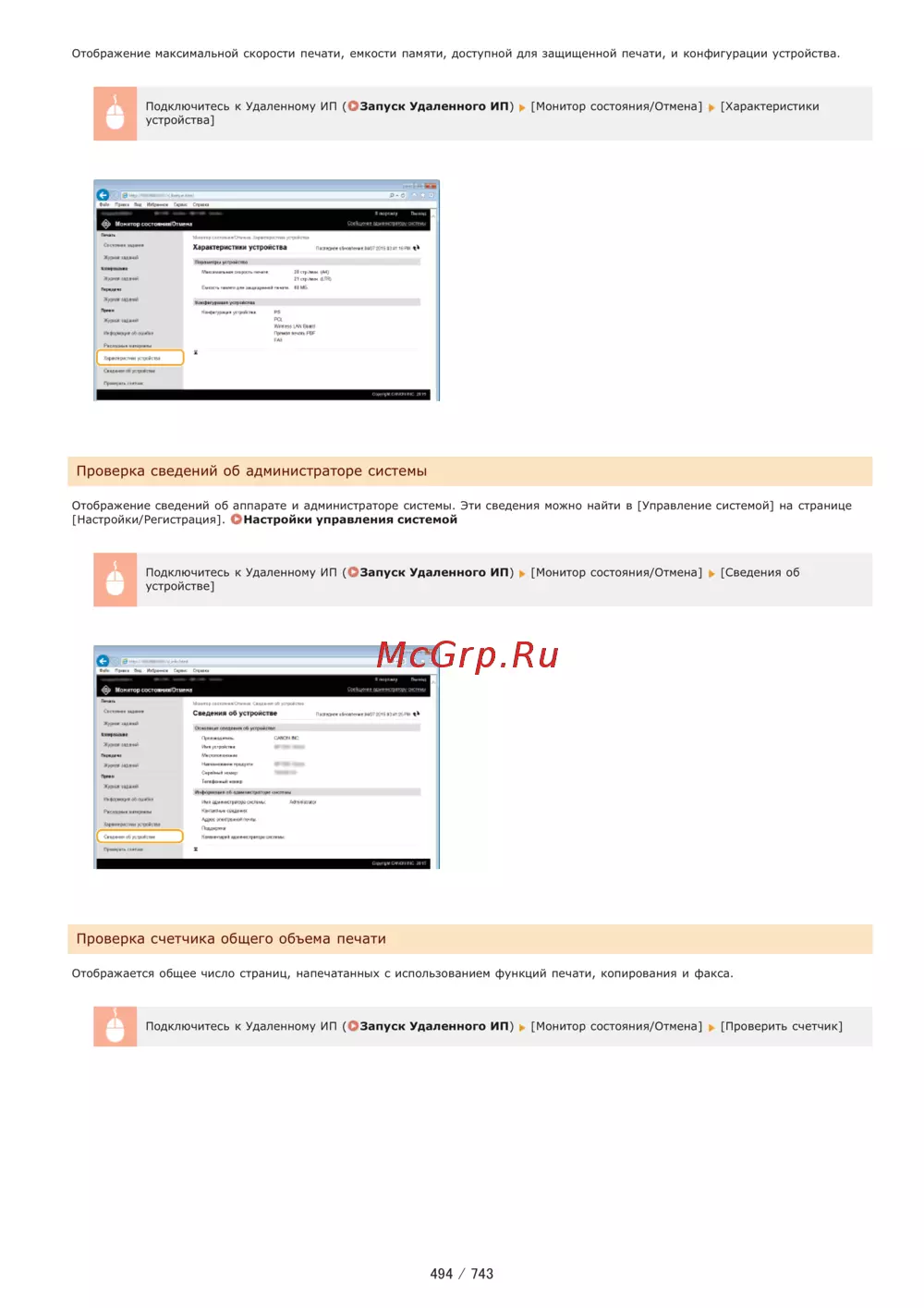 Отображение максимальной скорости печати емкости памяти доступной для защищенной печати и конфигурации устройства Подключитесь к Удаленному ИП ОЗапуск Удаленного ИП Монитор состояния Отмена Характеристики устройства Проверка сведений об администраторе системы Отображение сведений об аппарате и администраторе системы Эти сведения можно найти в Управление системой на странице Настройки Регистрация Настройки управления системой Подключитесь к Удаленному ИП ОЗапуск Удаленного ИП Монитор состояния Отмена Сведения об устройстве Проверка счетчика общего объема печати Отображается общее число страниц напечатанных с использованием функций печати копирования и факса Подключитесь к Удаленному ИП ОЗапуск Удаленного ИП Монитор состояния Отмена Проверить счетчик 494 743