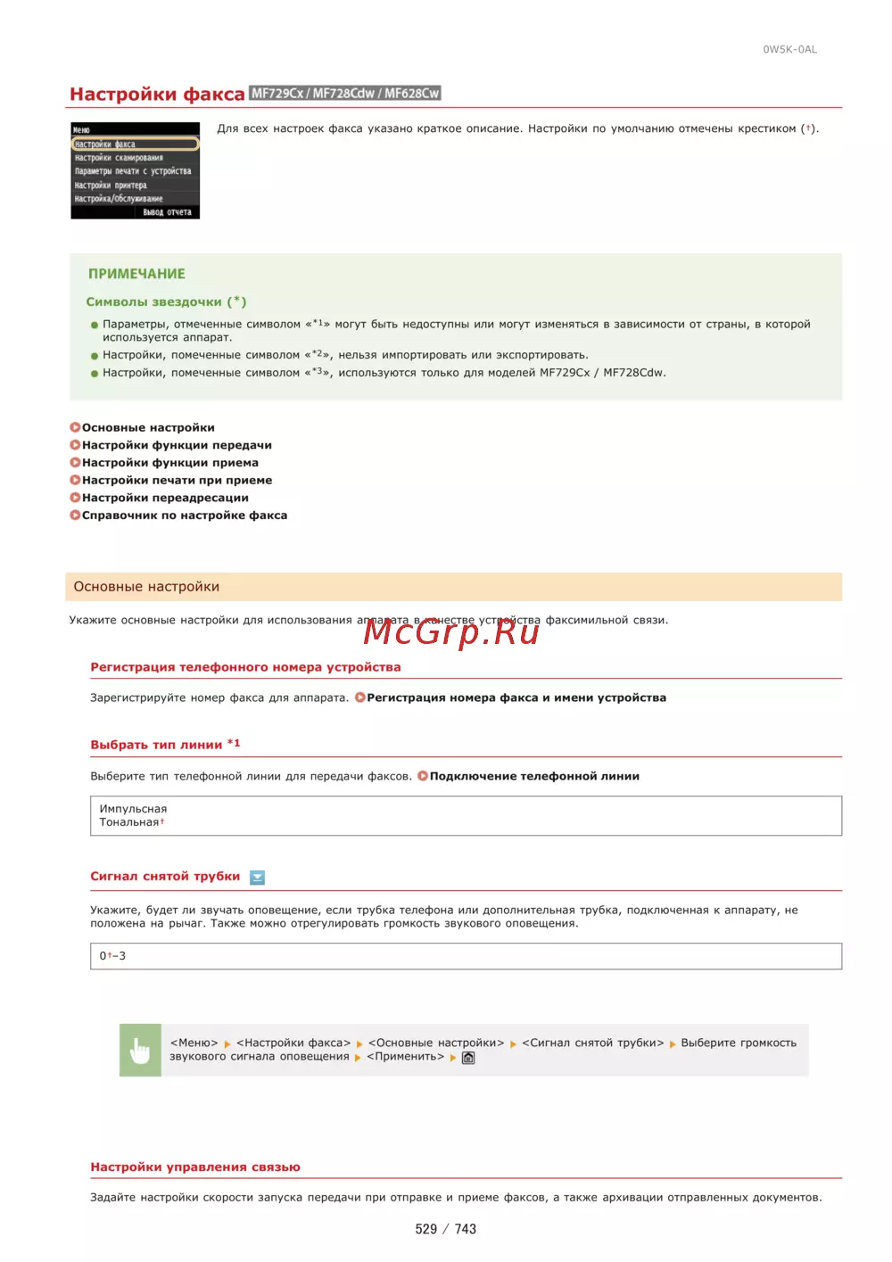 0W5K 0AL Настройки факса МР729СХ МР728Сс М Fб28Cw Для всех настроек факса указано краткое описание Настройки по умолчанию отмечены крестиком т Не настройки сканирования Параметры печати с устройства настройки принтера настройка обслужи ваиие Вывод отчета ПРИМЕЧАНИЕ Символы звездочки Параметры отмеченные символом 1 могут быть недоступны или могут изменяться в зависимости от страны в которой используется аппарат Настройки помеченные символом 2 нельзя импортировать или экспортировать Настройки помеченные символом 3 используются только для моделей МГ729Сх МГ728Сби ООсновные настройки ОНастройки функции передачи ОНастройки функции приема ОНастройки печати при приеме ОНастройки переадресации ОСправочник по настройке факса Основные настройки Укажите основные настройки для использования аппарата в качестве устройства факсимильной связи Регистрация телефонного номера устройства Зарегистрируйте номер факса для аппарата ОРегистрация номера факса и имени устройства Выбрать тип линии Выберите тип телефонной линии для передачи факсов Подключение телефонной линии Импульсная Тональная Сигнал снятой трубки г Укажите будет ли звучать оповещение если трубка телефона или дополнительная трубка подключенная к аппарату не положена на рычаг Также можно отрегулировать громкость звукового оповещения СИ 3 Меню Настройки факса Основные настройки к Сигнал снятой трубки ь Выберите звукового сигнала оповещения Применить Настройки управления связью Задайте настройки скорости запуска передачи при отправке и приеме факсов а также архивации отправленных документов 529 743