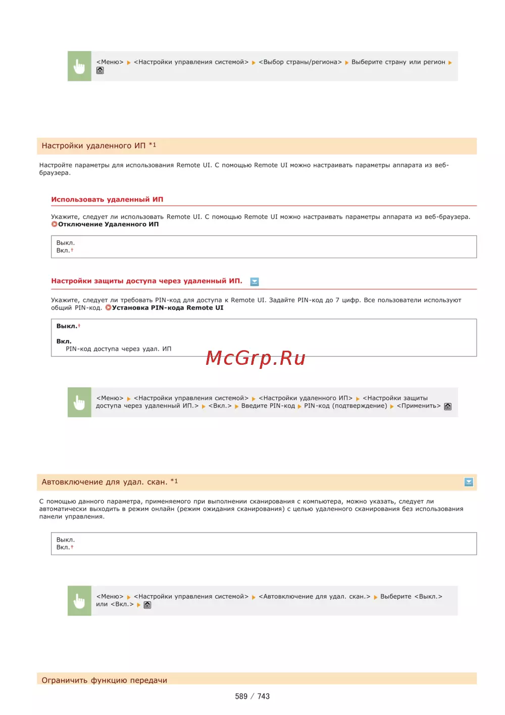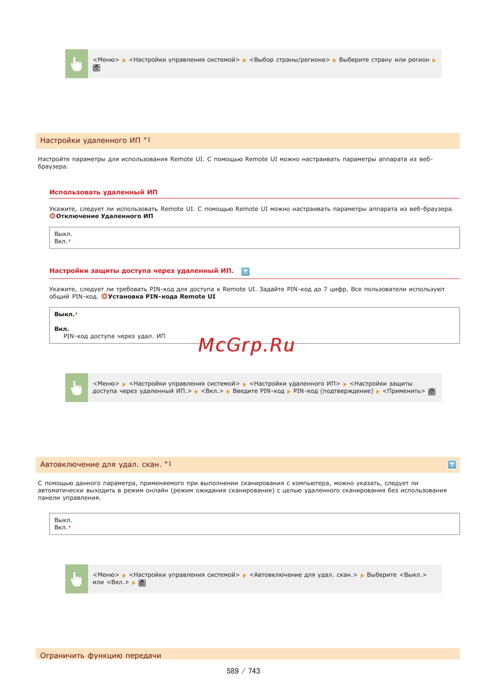 Меню Настройки управления системой Выбор страны региона Выберите страну или регион Настройки удаленного ИП 1 Настройте параметры для использования Remote UI С помощью Remote UI можно настраивать параметры аппарата из веб браузера Использовать удаленный ИП Укажите следует ли использовать Remote UI С помощью Remote UI можно настраивать параметры аппарата из веб браузера Отключение Удаленного ИП Выкл ВклЛ Настройки защиты доступа через удаленный ИП Укажите следует ли требовать PIN код для доступа к Remote UI Задайте PIN код до 7 цифр Все пользователи используют общий PIN код ОУстановка PIN кода Remote UI Выкл г Вкл PIN код доступа через удал ИП Меню Настройки управления системой Настройки удаленного ИП Настройки защиты доступа через удаленный ИП Вкл Введите РЖ код РЖ код подтверждение Применить Автовключение для удал скан 1 В С помощью данного параметра применяемого при выполнении сканирования с компьютера можно указать следует ли автоматически выходить в режим онлайн режим ожидания сканирования с целью удаленного сканирования без использования панели управления Выкл Вкл Меню Настройки управления системой Автовключение для удал скан Выберите Выкл или Вкл g Ограничить функцию передачи 589 743