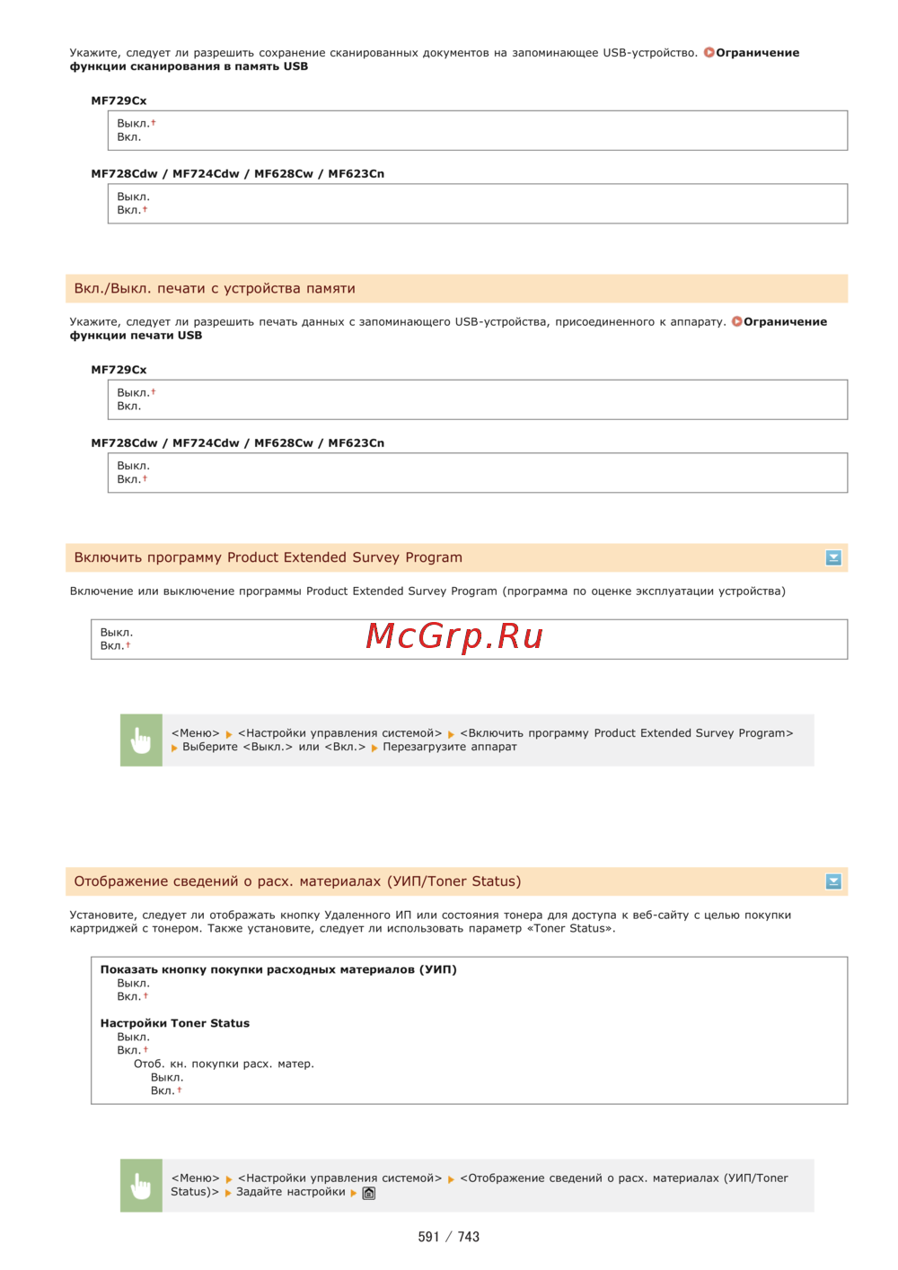 Укажите следует ли разрешить сохранение сканированных документов на запоминающее USB устройство ООграничение функции сканирования в память USB MF729CX Выкл Л Вкл MF728Cdw MF724Cdw MF628CW MF623Cn Выкл Вкл i Вкл Выкл печати с устройства памяти Укажите следует ли разрешить печать данных с запоминающего USB устройства присоединенного к аппарату Ограничение функции печати USB MF729CX ВыклЛ Вкл MF728Cdw MF724Cdw MF628CW MF623Cn Выкл Вкл Л Включить программу Product Extended Survey Program Включение или выключение программы Product Extended Survey Program программа по оценке эксплуатации устройства Выкл ВклЛ Меню Настройки управления системой к Включить программу Product Extended Survey Program Выберите Выкл или Вкл Перезагрузите аппарат Отображение сведений о расх материалах УИП Toner Status Установите следует ли отображать кнопку Удаленного ИП или состояния тонера для доступа к веб сайту с целью покупки картриджей стонером Также установите следует ли использовать параметр Toner Status Показать кнопку покупки расходных материалов УИП Выкл ВклЛ Настройки Toner Status Выкл ВклЛ Отоб кн покупки расх матер Выкл ВклЛ Меню Настройки управления системой Отображение сведений о расх материалах УИП Топег Status Задайте настройки Щ 591 743