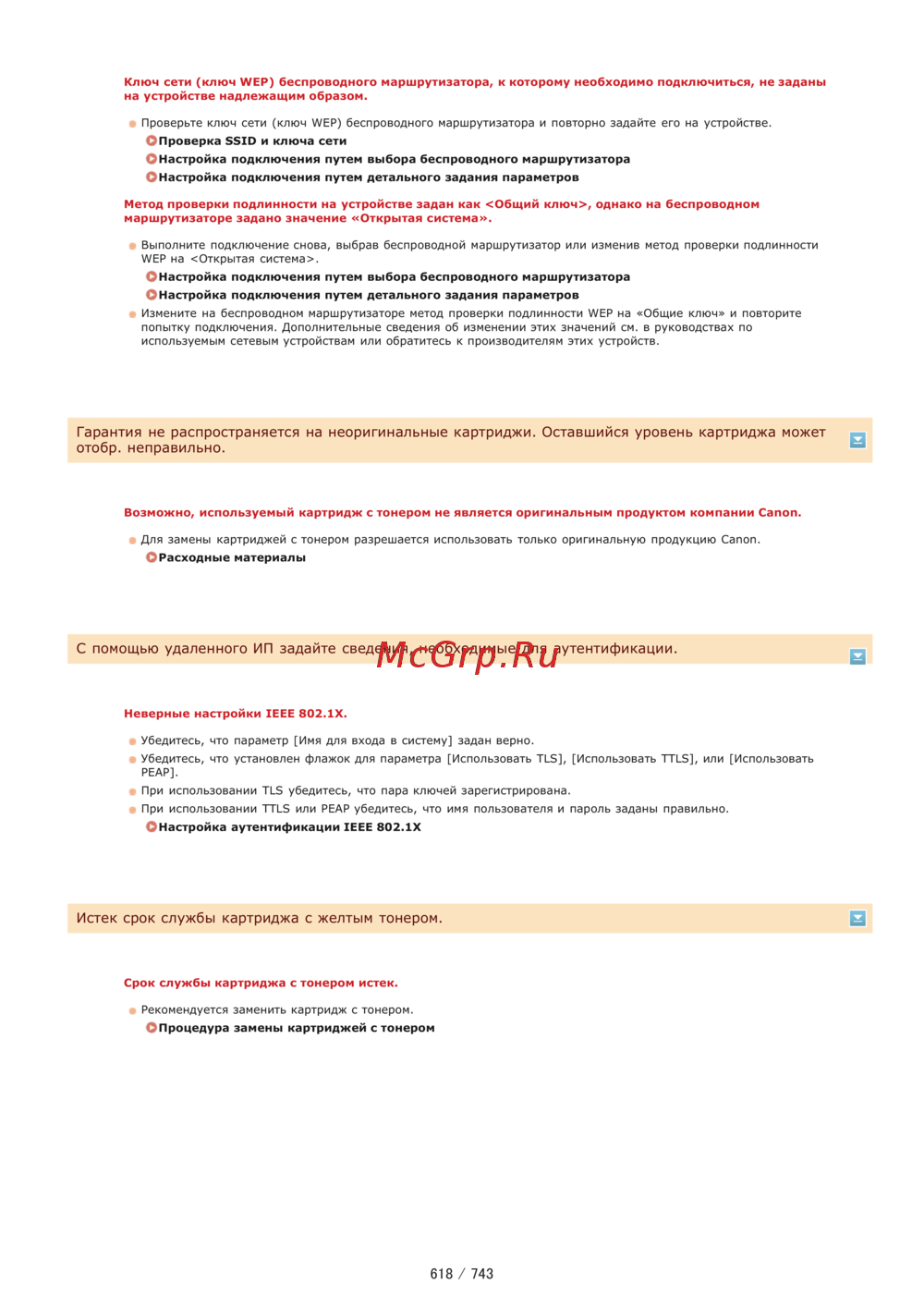 Ключ сети ключ WEP беспроводного маршрутизатора к которому необходимо подключиться не заданы на устройстве надлежащим образом Проверьте ключ сети ключ WEP беспроводного маршрутизатора и повторно задайте его на устройстве О Проверка SSID и ключа сети С Настройка подключения путем выбора беспроводного маршрутизатора О Настройка подключения путем детального задания параметров Метод проверки подлинности на устройстве задан как сОбщий ключ однако на беспроводном маршрутизаторе задано значение Открытая система Выполните подключение снова выбрав беспроводной маршрутизатор или изменив метод проверки подлинности WEP на Открытая система С Настройка подключения путем выбора беспроводного маршрутизатора О Настройка подключения путем детального задания параметров Измените на беспроводном маршрутизаторе метод проверки подлинности WEP на Общие ключ и повторите попытку подключения Дополнительные сведения об изменении этих значений см в руководствах по используемым сетевым устройствам или обратитесь к производителям этих устройств Гарантия не распространяется на неоригинальные картриджи Оставшийся уровень картриджа может отобр неправильно Возможно используемый картридж с тонером не является оригинальным продуктом компании Canon Для замены картриджей стонером разрешается использовать только оригинальную продукцию Canon О Расходные материалы С помощью удаленного ИП задайте сведения необходимые для аутентификации Неверные настройки IEEE 802 IX Убедитесь что параметр Имя для входа в систему задан верно Убедитесь что установлен флажок для параметра Использовать TLS Использовать TTLS или Использовать РЕАР При использовании TLS убедитесь что пара ключей зарегистрирована При использовании TTLS или РЕАР убедитесь что имя пользователя и пароль заданы правильно О Настройка аутентификации IEEE 802 IX Истек срок службы картриджа с желтым тонером Срок службы картриджа с тонером истек Рекомендуется заменить картридж с тонером ОПроцедура замены картриджей с тонером 618 743