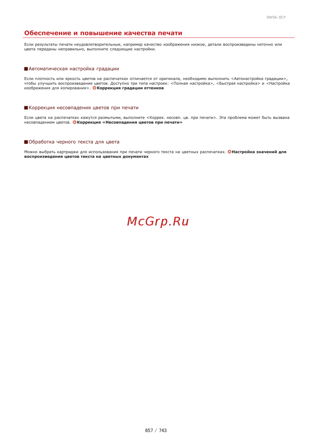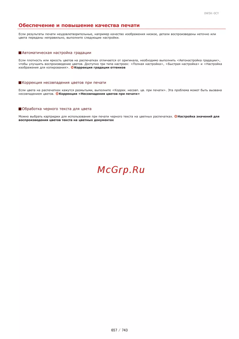 0W5K 0CY Обеспечение и повышение качества печати Если результаты печати неудовлетворительные например качество изображения низкое детали воспроизведены неточно или цвета переданы неправильно выполните следующие настройки Автоматическая настройка градации Если плотность или яркость цветов на распечатках отличается от оригинала необходимо выполнить Автонастройка градации чтобы улучшить воспроизведение цветов Доступно три типа настроек Полная настройка Быстрая настройка и Настройка изображения для копированиях С Коррекция градации оттенков Коррекция несовпадения цветов при печати Если цвета на распечатках кажутся размытыми выполните Коррек несовп цв при печати Эта проблема может быть вызвана несовпадением цветов С Коррекция Несовпадения цветов при печати Обработка черного текста для цвета Можно выбрать картриджи для использования при печати черного текста на цветных распечатках ОНастройка значений для воспроизведения цветов текста на цветных документах 657 743