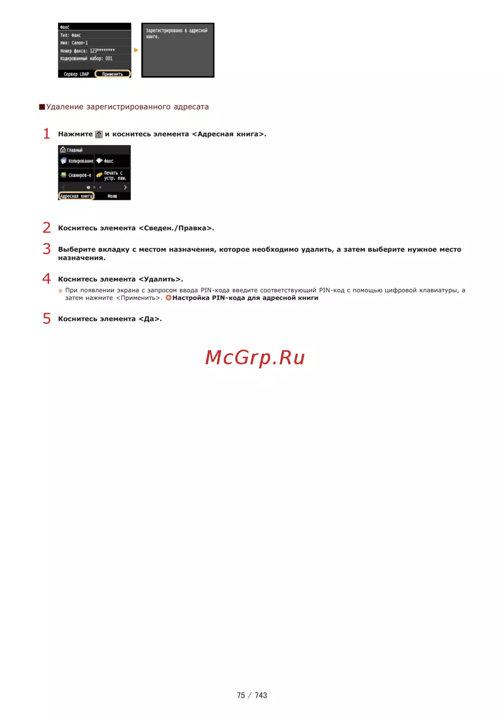 аде__________________________ тип лаке Зарегистрировано в адресной книге имя Canon 1 ноиер фамса 12З кодированным набор 001 сервер ЮАР ппжгенмть Удаление зарегистрированного адресата 1 Нажмите Щ и коснитесь элемента Адресная книга пивным Ф Копирование Факс МвеснаГТнм Меню Коснитесь элемента Сведен Правка Выберите вкладку с местом назначения которое необходимо удалить а затем выберите нужное место назначения Коснитесь элемента Удалить При появлении экрана с запросом ввода Р11М кода введите соответствующий РИЧ код с помощью цифровой клавиатуры а затем нажмите Применить ОНастройка Р1М кода для адресной книги Коснитесь элемента Да 75 743