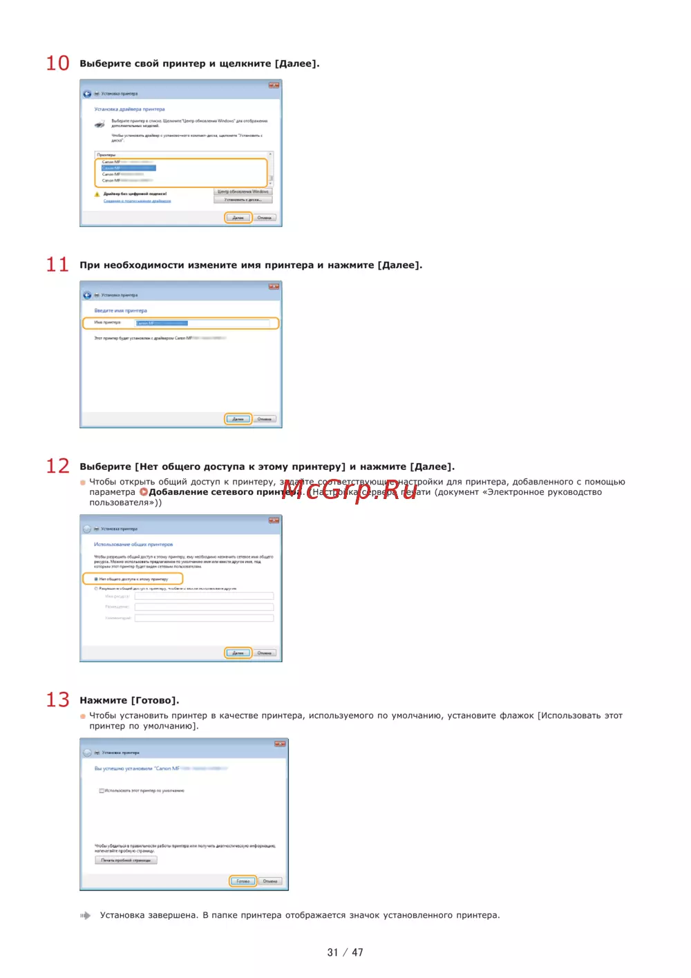 10 Выберите свой принтер и щелкните Далее 11 При необходимости измените имя принтера и нажмите Далее 12 Выберите Нет общего доступа к этому принтеру и нажмите Далее Чтобы открыть общий доступ к принтеру задайте соответствующие настройки для принтера добавленного с помощью параметра Добавление сетевого принтера Настройка сервера печати документ Электронное руководство пользователя 13 Нажмите Готово Чтобы установить принтер в качестве принтера используемого по умолчанию установите флажок Использовать этот принтер по умолчанию Установка завершена В папке принтера отображается значок установленного принтера 31 47