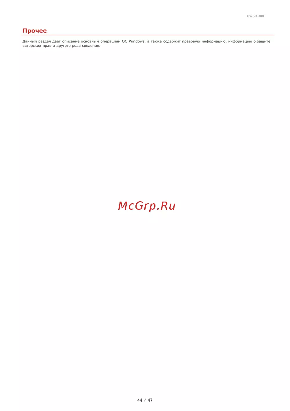 0W6H 00H Прочее Данный раздел дает описание основным операциям ОС Windows а также содержит правовую информацию информацию о защите авторских прав и другого рода сведения 44 47
