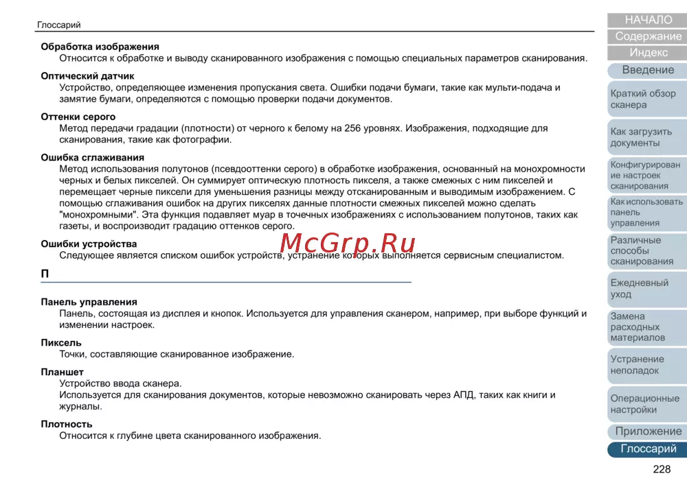 - A параметры сканера p.220