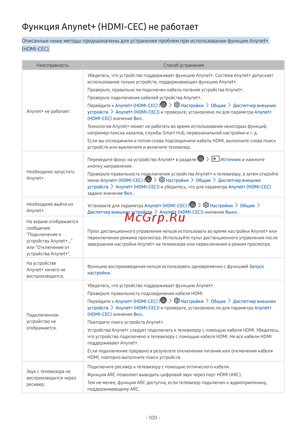 устройств Anynet+ (HDMI-CEC)) и проверьте, установлено ли для параметра Anynet+