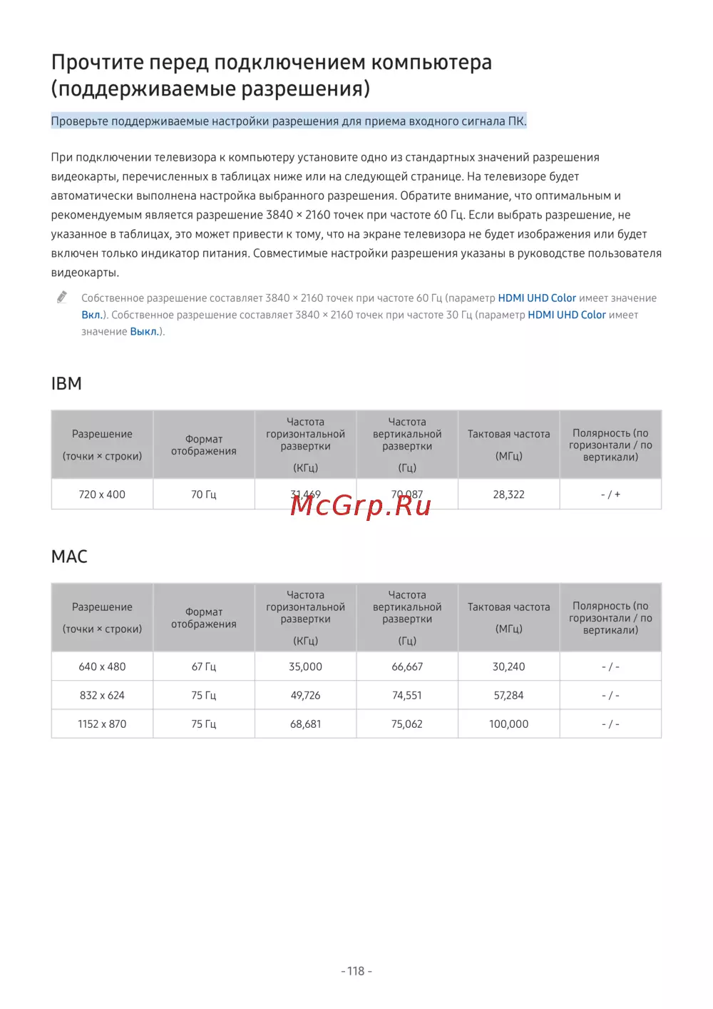 Samsung Series 6 UE65MU6670U — подключение компьютера к телевизору: поддерживаемые разрешения [124/155]