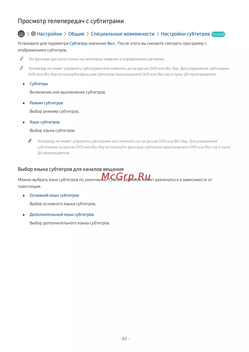 " Телевизор не может управлять субтитрами или изменять их на дисках DVD или Blu-Ray. Для управления