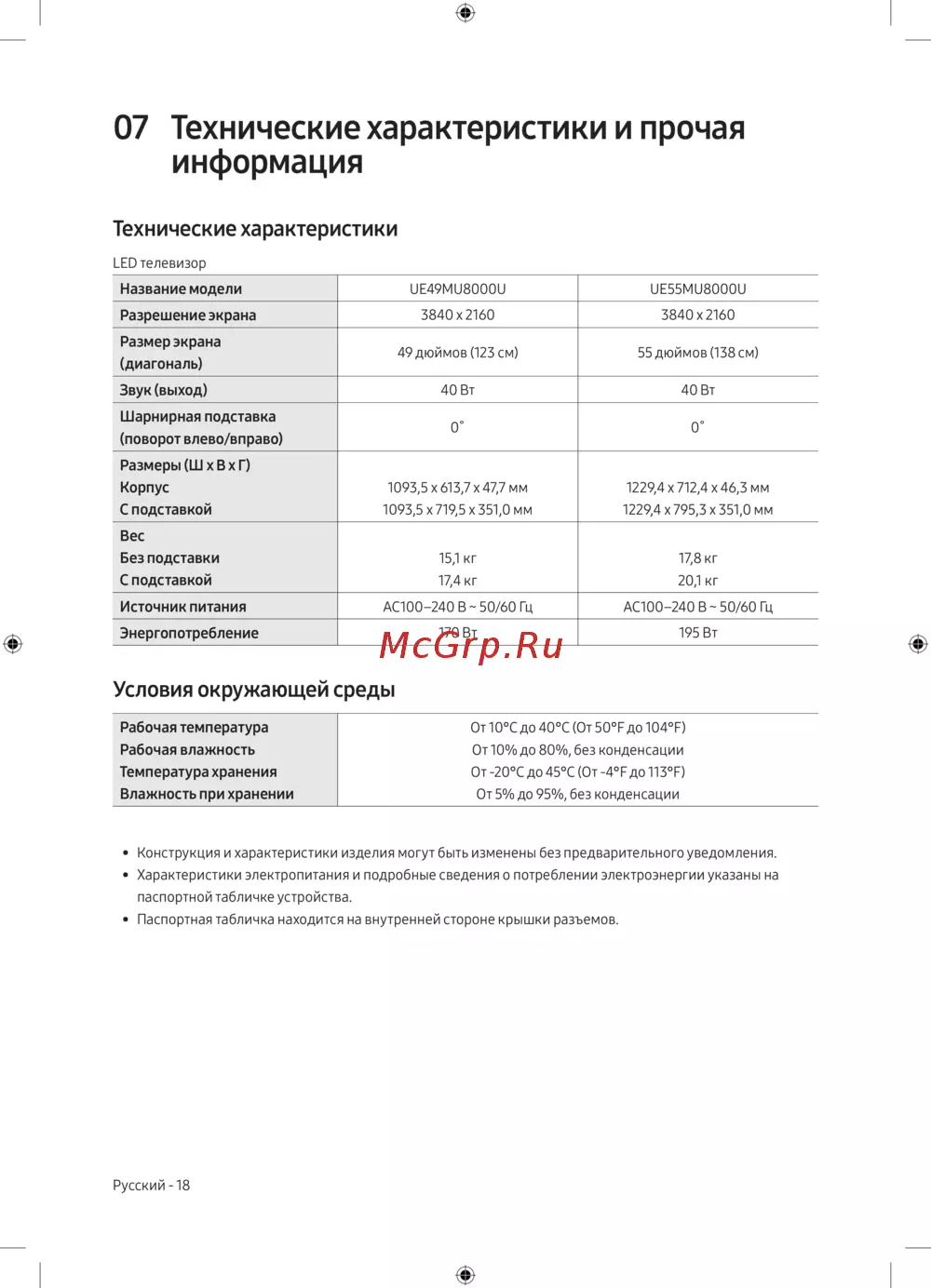 Samsung Series 8 UE75MU8000U [18/92] Технические характеристики