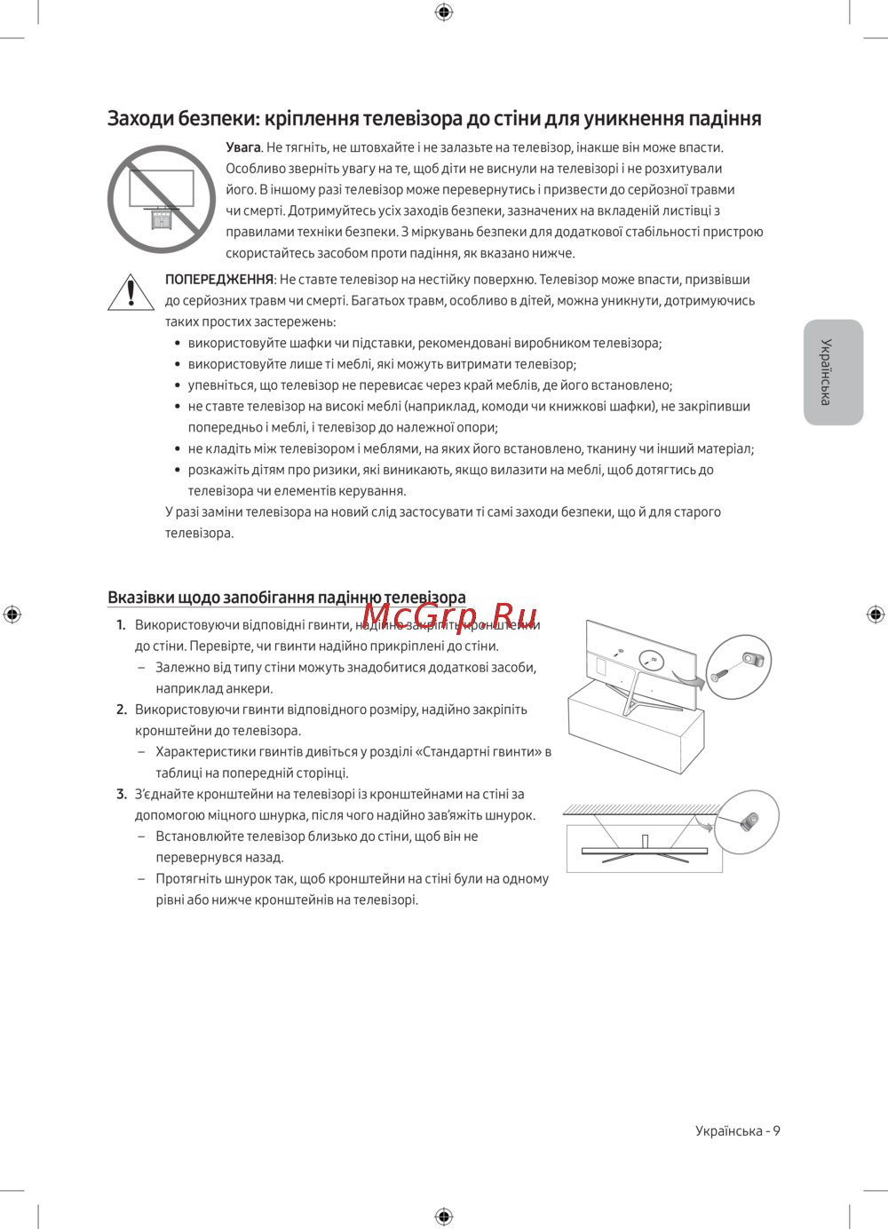 - Меры предосторожности надежное крепление телевизора к стене p.9