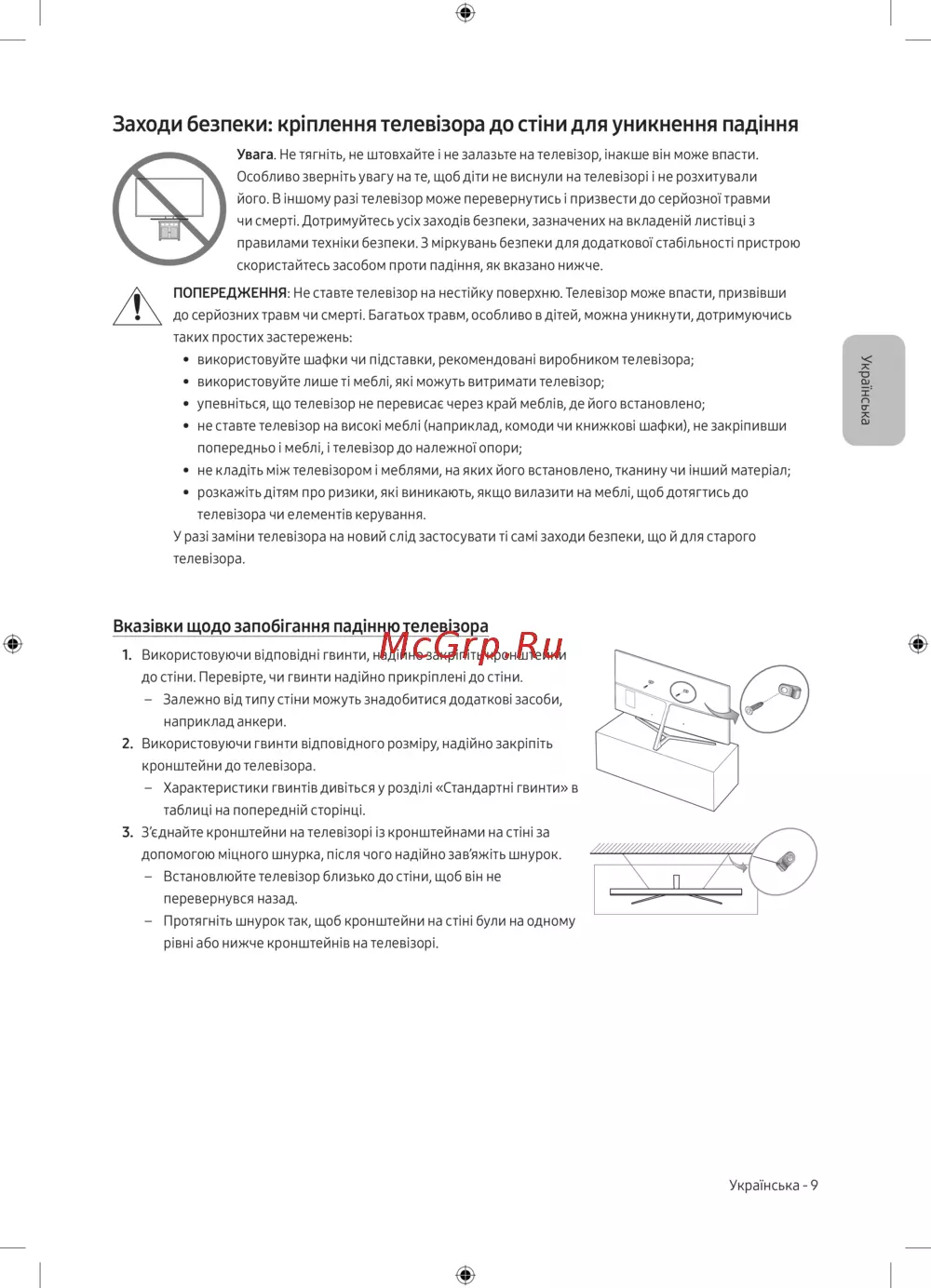 Увага. Не тягніть, не штовхайте і не залазьте на телевізор, інакше він може впасти.