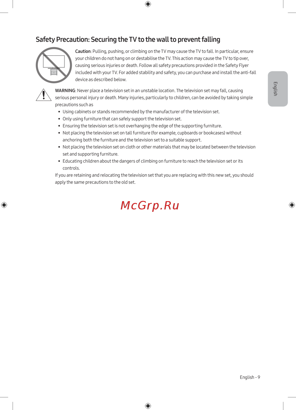 - Меры предосторожности надежное крепление телевизора к стене p.9