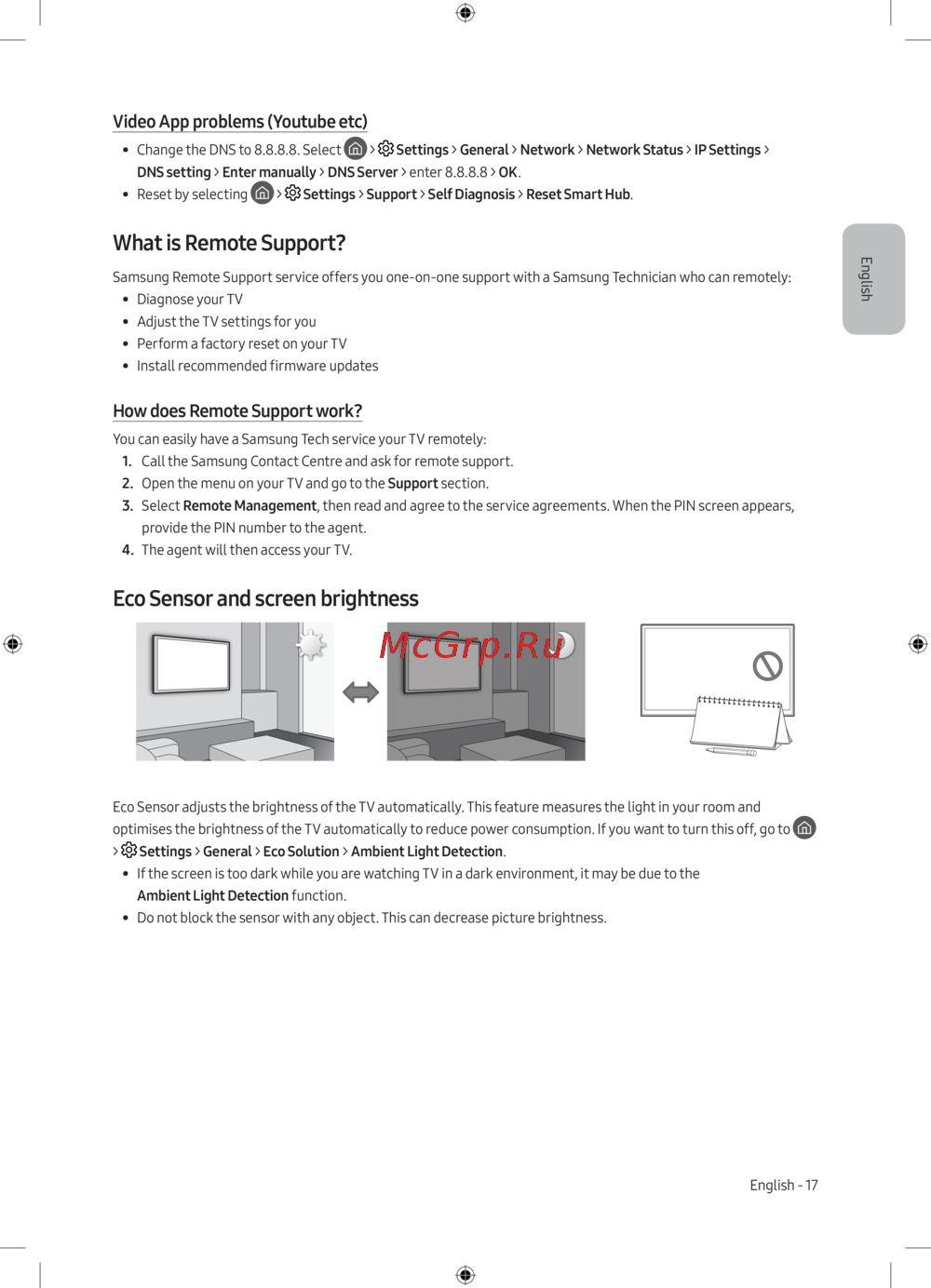 Eco Sensor adjusts the brightness of the TV automatically. This feature measures the light in your room and