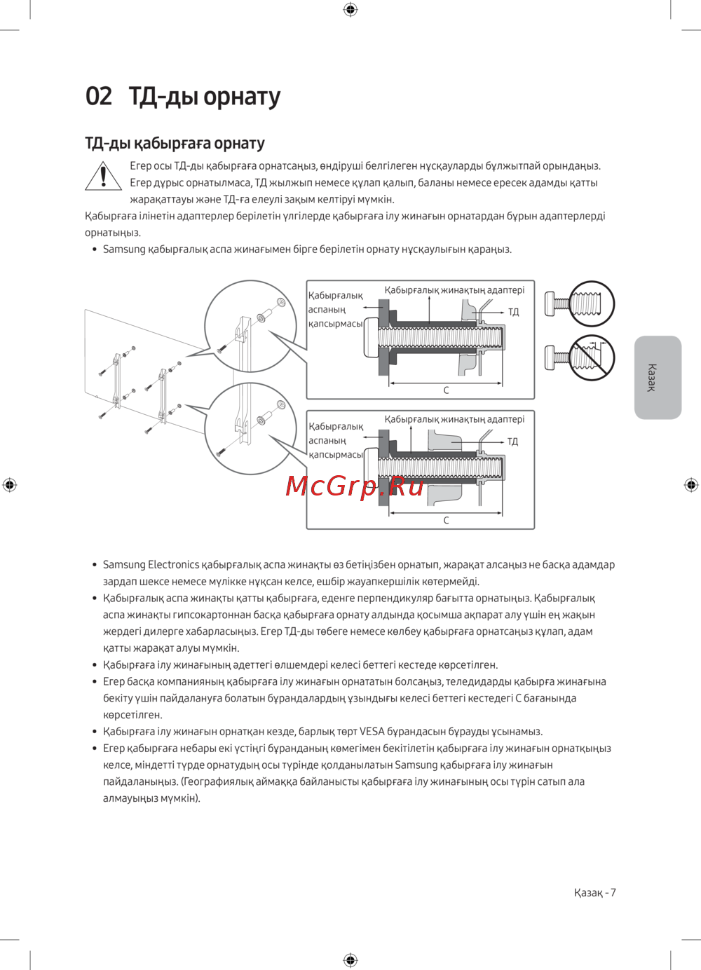 Егер осы ТД-ды қабырғаға орнатсаңыз, өндіруші белгілеген нұсқауларды бұлжытпай орындаңыз.