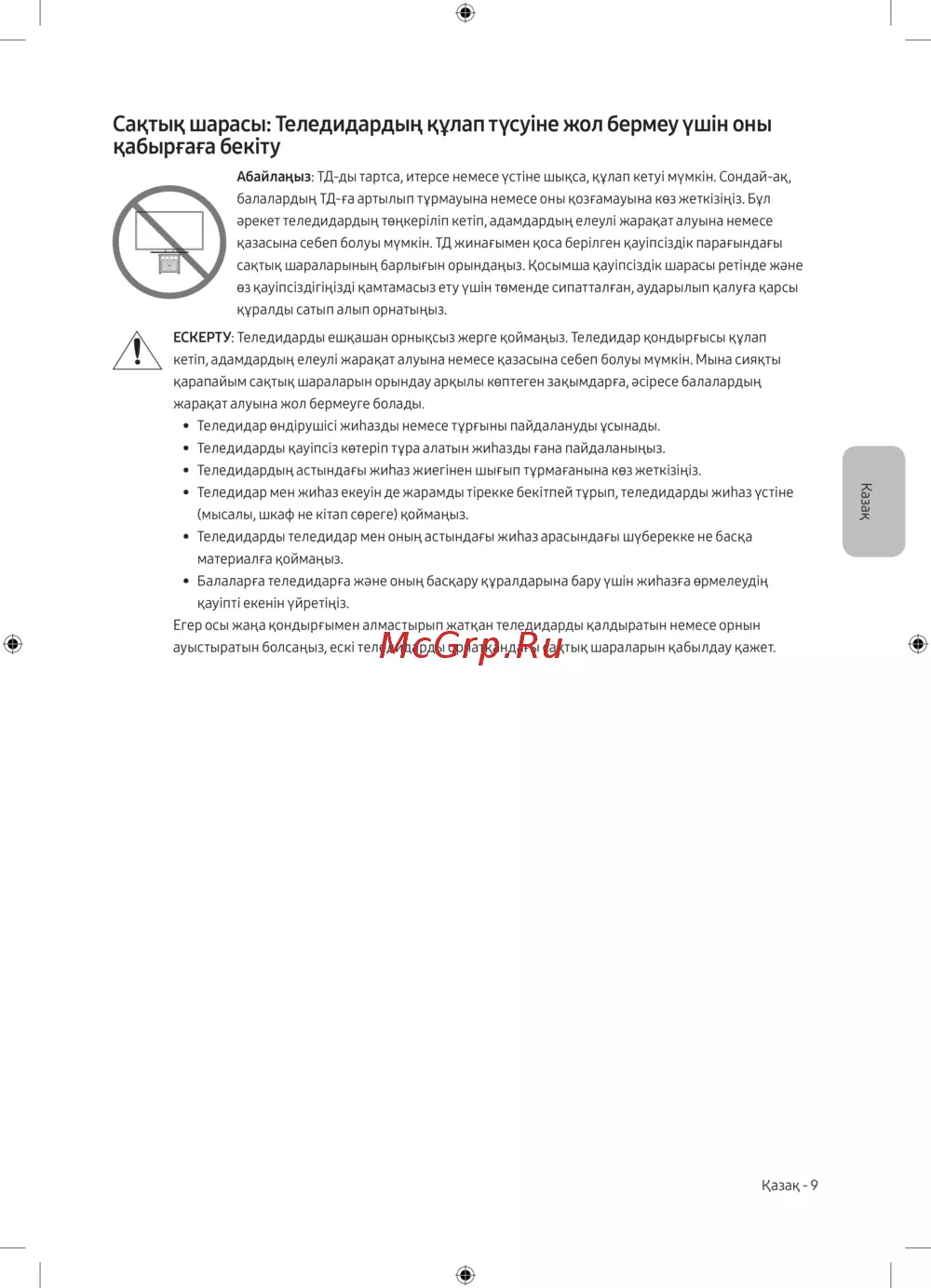 - Сақтық шарасы теледидардың құлап түсуіне жол бермеу үшін оны қабырғаға бекіту p.75