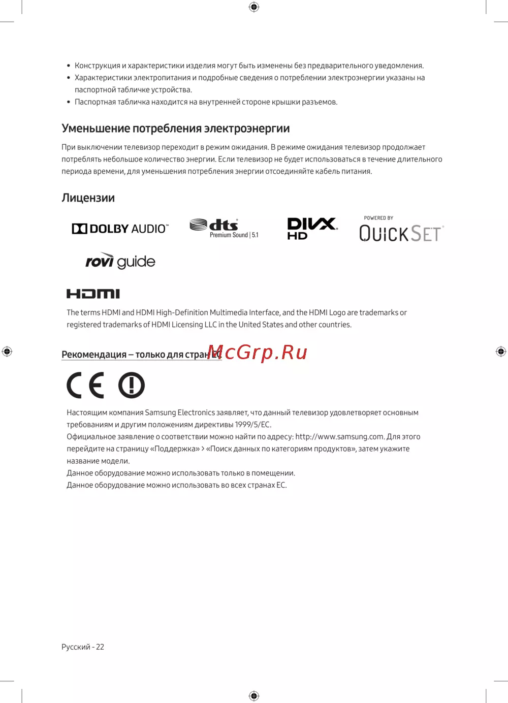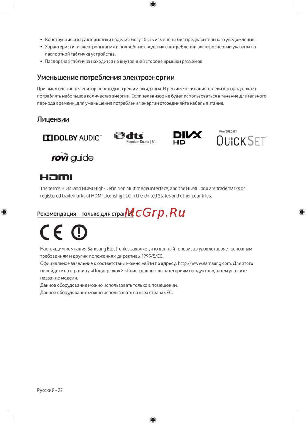 Официальное заявление о соответствии можно найти по адресу: http://www.samsung.com. Для этого