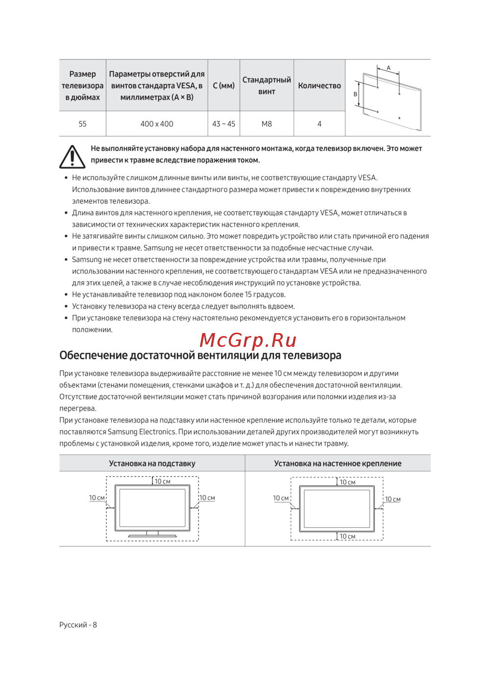 - Обеспечение достаточной вентиляции для телевизора p.10