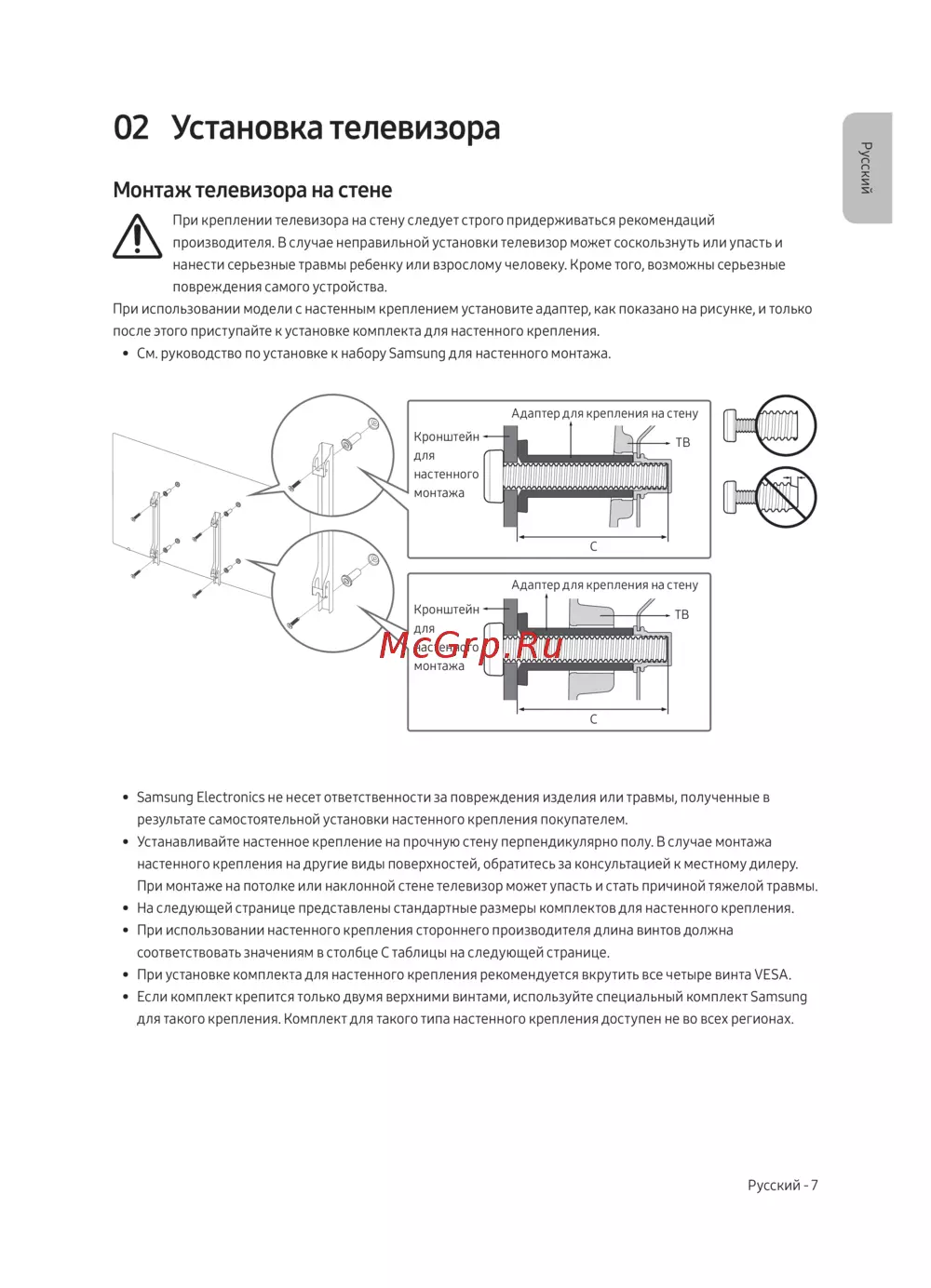 - Меры предосторожности надежное крепление телевизора к стене p.11