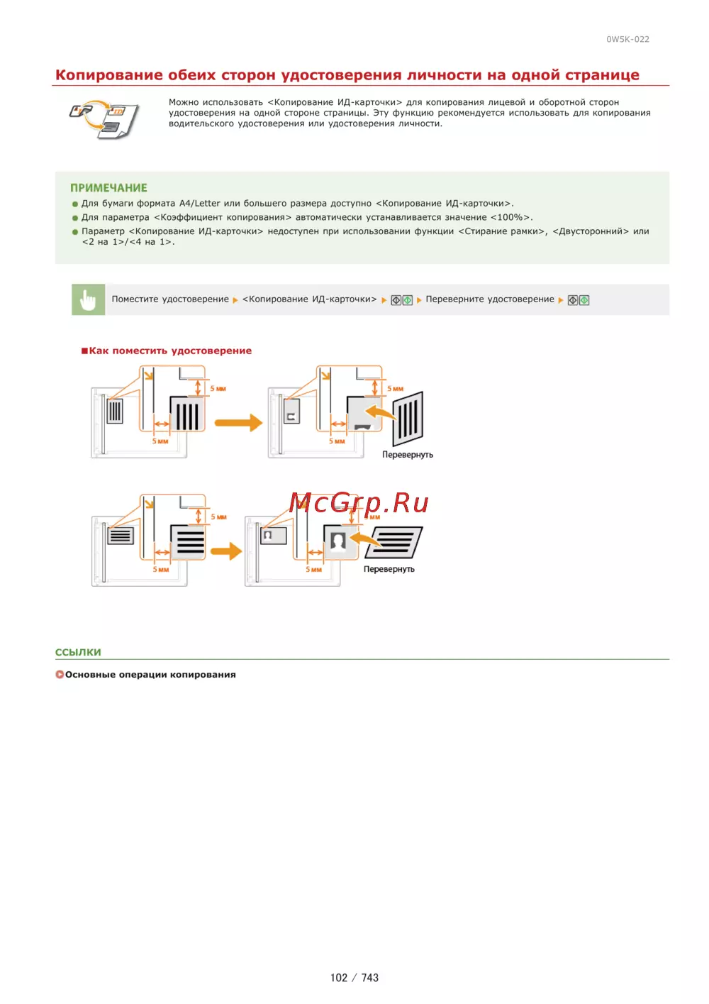 0W5K 022 Копирование обеих сторон удостоверения личности на одной странице Можно использовать копирование ИД карточки для копирования лицевой и оборотной сторон удостоверения на одной стороне страницы Эту функцию рекомендуется использовать для копирования водительского удостоверения или удостоверения личности ПРИМЕЧАНИЕ Для бумаги формата А4 ЬеИег или большего размера доступно Копирование ИД карточки в Для параметра Коэффициент копирования автоматически устанавливается значение 100 Параметр Копирование ИД карточки недоступен при использовании функции Стирание рамки Двусторонний или 2 на 1 4 на 1 Поместите удостоверение к Копирование ИД карточки ф ф Переверните удостоверение ф1 ф Как поместить удостоверение Перевернуть ССЫЛКИ ООсновные операции копирования 102 743