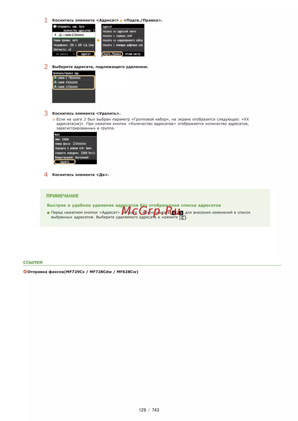 Коснитесь элемента Адресат Подтв Правка отправить нал пуск Адресат_____________________________ __________ количество адресатов 3 Указать из адресной книги á a 123saxa Указать с сервера LDAP Релии приена АВТО Указать из кодированного набор Разрешение 200 х 104 т д Нор Указать с пмоцыо цифровых кла плотность 10 на рычаге R Адресат 2 подтв гравк отзыв настр Выберите адресата подлежащего удалению 3 Коснитесь элемента Удалить Если на шаге 2 был выбран параметр Групповой набор на экране отобразится следующее XX адресата ов При нажатии кнопки Количество адресатов отображается количество адресатов зарегистрированных в группе МКС_________________________________ ИИ CANOS номер факса 1 3ххшхх передача в решые ЕСИ выки Скорость передача 33600 бит с иелдуго родным внутренний 4 Коснитесь элемента Да ПРИМЕЧАНИЕ Быстрое и удобное удаление адресатов без отображения списка адресатов Перед нажатием кнопки Адресат на шаге 1 можно нажатьННдля внесения изменений в список выбранных адресатов Выберите удаляемого адресата и нажмите С ССЫЛКИ ООтправка факсов МР729Сх MF728Cdw MF628Cw 129 743