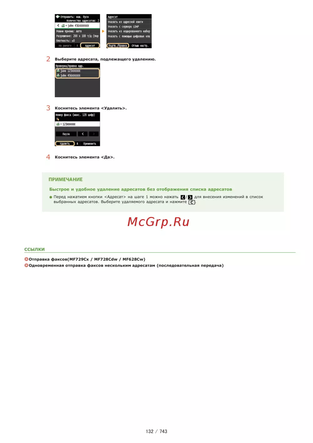 Отправить нал пуск _________ количество адресатов 2 й оЬп 456ХХХХХХХ Адресат______________________________ Указать из адресной книги Указать с сервера имя Рехии прием Авто Указать из кодированного набор Разрешение 200 х 100 т д нор Указать с пмоцыо цифровых к ла плотность 10 на рычаге R одтаТгравк отзыв настр 2 Выберите адресата подлежащего удалению 3 Коснитесь элемента Удалить 4 Коснитесь элемента Да ПРИМЕЧАНИЕ Быстрое и удобное удаление адресатов без отображения списка адресатов Перед нажатием кнопки Адресат на шаге 1 можно нажатьИНдля внесения изменений в список выбранных адресатов Выберите удаляемого адресата и нажмите С ССЫЛКИ О Отправка факсов МР729Сх МР728Сди MF628Cw Одновременная отправка факсов нескольким адресатам последовательная передача 132 743