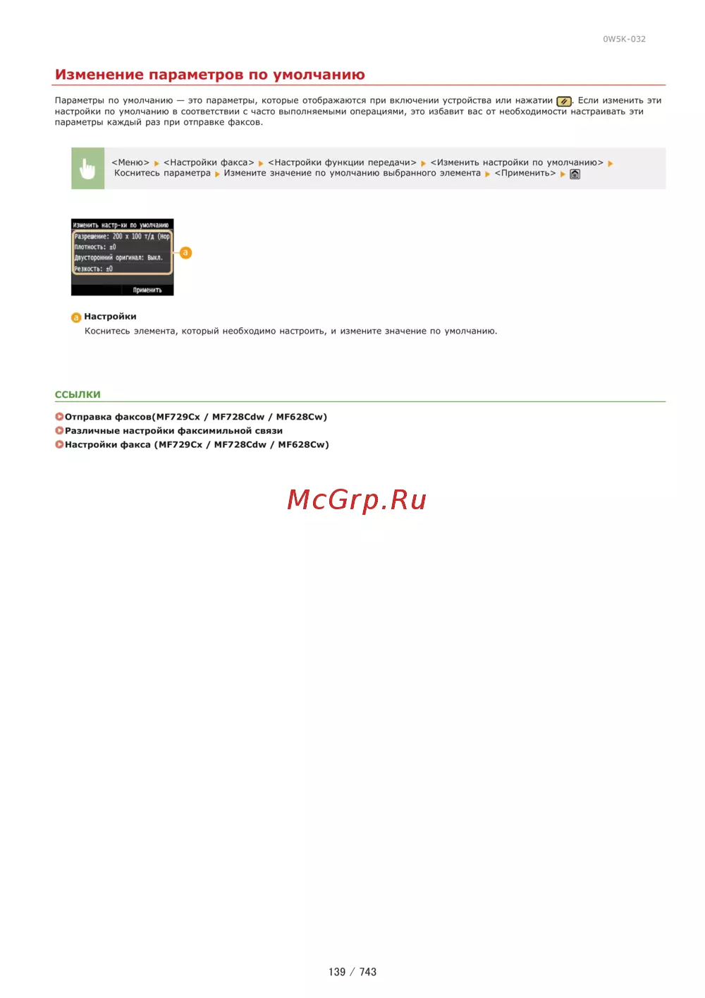 0W5K 032 Изменение параметров по умолчанию Параметры по умолчанию это параметры которые отображаются при включении устройства или нажатии Если изменить эти настройки по умолчанию в соответствии с часто выполняемыми операциями это избавит вас от необходимости настраивать эти параметры каждый раз при отправке факсов Настройки Коснитесь элемента который необходимо настроить и измените значение по умолчанию ССЫЛКИ О Отправка факсов МР729Сх МР728Сди MF628Cw Различные настройки факсимильной связи Настройки факса МР729СХ МР728Сди MF628Cw 139 743
