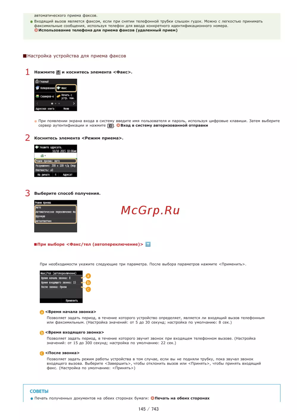 автоматического приема факсов Входящий вызов является факсом если при снятии телефонной трубки слышен гудок Можно с легкостью принимать факсимильные сообщения используя телефон для ввода конкретного идентификационного номера С Использование телефона для приема факсов удаленный прием Настройка устройства для приема факсов 1 Нажмите Щ и коснитесь элемента Факс главный Копирование Сканиров е II печать с устр паи о Адресная книга меню При появлении экрана входа в систему введите имя пользователя и пароль используя цифровые клавиши Затем выберите сервер аутентификации и нажмите 1Р Вход в систему авторизованной отправки 2 Коснитесь элемента Режим приема ф укажите адресата ________________ 10 10 2015 Ю 00AM Разрешение 200 x 100 т д пор плотность iQ на рычаге R Адресат 3 Выберите способ получения При выборе Факс тел автопереключение В При необходимости укажите следующие три параметра После выбора параметров нажмите Применить Фмс тел автоле рек лечение время начала звониа 8 время входяцего звонка 15 после звонка Прием применить Время начала звонка Позволяет задать период в течение которого устройство определяет является ли входящий вызов телефонным или факсимильным Настройка значений от 5 до 30 секунд настройка по умолчанию 8 сек 0 Время входящего звонка Позволяет задать период в течение которого звучит звонок при входящем телефонном вызове Настройка значений от 15 до 300 секунд настройка по умолчанию 22 сек 3 После звонка Позволяет задать режим работы устройства в том случае если вы не подняли трубку пока звучал звонок входящего вызова Выберите Завершить чтобы отклонить вызов или Принять чтобы принять входящий факс Настройка по умолчанию Принять СОВЕТЫ Печать полученных документов на обеих сторонах бумаги Печать на обеих сторонах 145 743