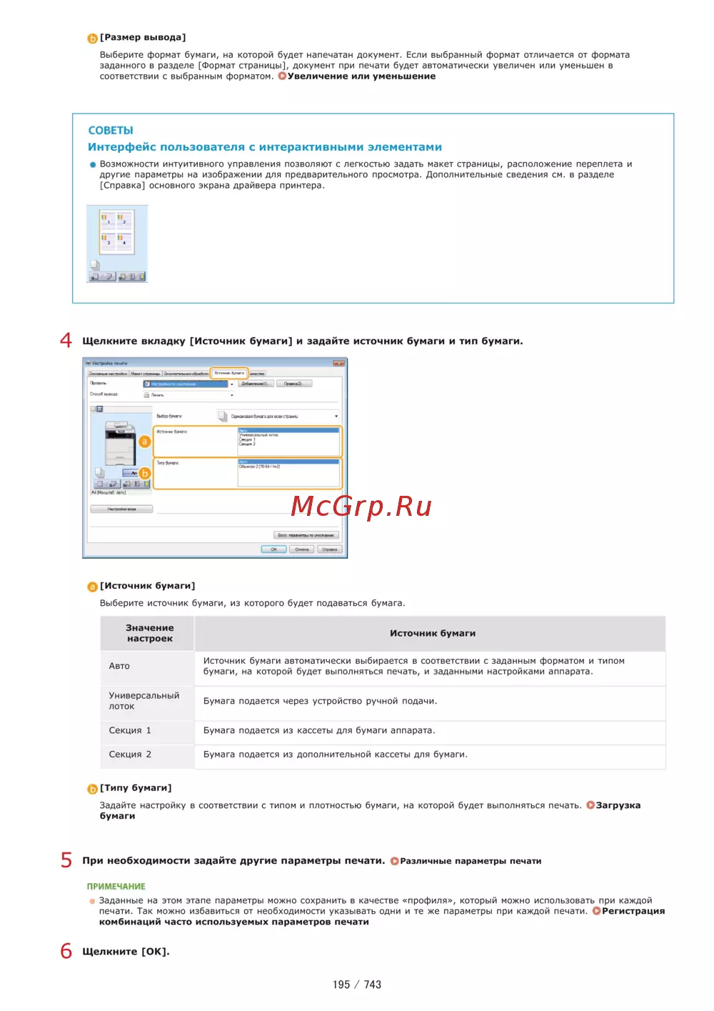 ф Размер вывода Выберите формат бумаги на которой будет напечатан документ Если выбранный формат отличается от формата заданного в разделе Формат страницы документ при печати будет автоматически увеличен или уменьшен в соответствии с выбранным форматом Увеличение или уменьшение СОВЕТЫ Интерфейс пользователя с интерактивными элементами Возможности интуитивного управления позволяют с легкостью задать макет страницы расположение переплета и другие параметры на изображении для предварительного просмотра Дополнительные сведения см в разделе Справка основного экрана драйвера принтера ии 1 и3и 4 ___ _____ 4 Щелкните вкладку Источник бумаги и задайте источник бумаги и тип бумаги Источник бумаги Выберите источник бумаги из которого будет подаваться бумага Значение настроек Источник бумаги Авто Источник бумаги автоматически выбирается в соответствии с заданным форматом и типом бумаги на которой будет выполняться печать и заданными настройками аппарата Универсальный лоток Бумага подается через устройство ручной подачи Секция 1 Бумага подается из кассеты для бумаги аппарата Секция 2 Бумага подается из дополнительной кассеты для бумаги Типу бумаги Задайте настройку в соответствии с типом и плотностью бумаги на которой будет выполняться печать Загрузка бумаги Э При необходимости задайте другие параметры печати Различные параметры печати ПРИМЕЧАНИЕ Заданные на этом этапе параметры можно сохранить в качестве профиля который можно использовать при каждой печати Так можно избавиться от необходимости указывать одни и те же параметры при каждой печати Регистрация комбинаций часто используемых параметров печати 6 Щелкните ОК 195 743