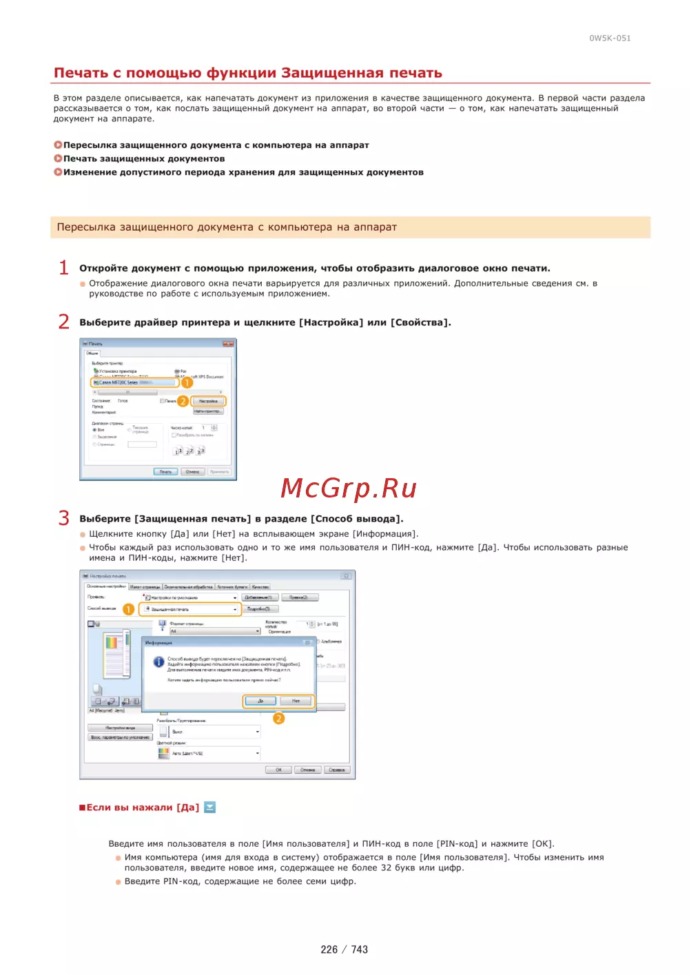 0W5K 051 Печать с помощью функции Защищенная печать В этом разделе описывается как напечатать документ из приложения в качестве защищенного документа В первой части раздела рассказывается о том как послать защищенный документ на аппарат во второй части о том как напечатать защищенный документ на аппарате ОПересылка защищенного документа с компьютера на аппарат ОПечать защищенных документов С Изменение допустимого периода хранения для защищенных документов Пересылка защищенного документа с компьютера на аппарат Откройте документ с помощью приложения чтобы отобразить диалоговое окно печати Отображение диалогового окна печати варьируется для различных приложений Дополнительные сведения см в руководстве по работе с используемым приложением Выберите драйвер принтера и щелкните Настройка или Свойства Выберите Защищенная печать в разделе Способ вывода Щелкните кнопку Да или Нет на всплывающем экране Информация Чтобы каждый раз использовать одно и то же имя пользователя и ПИН код нажмите Да Чтобы использовать разные имена и ПИН коды нажмите Нет Если вы нажали Да Введите имя пользователя в поле Имя пользователя и ПИН код в поле PIN код и нажмите ОК Имя компьютера имя для входа в систему отображается в поле Имя пользователя Чтобы изменить имя пользователя введите новое имя содержащее не более 32 букв или цифр Введите PIN код содержащие не более семи цифр 226 743