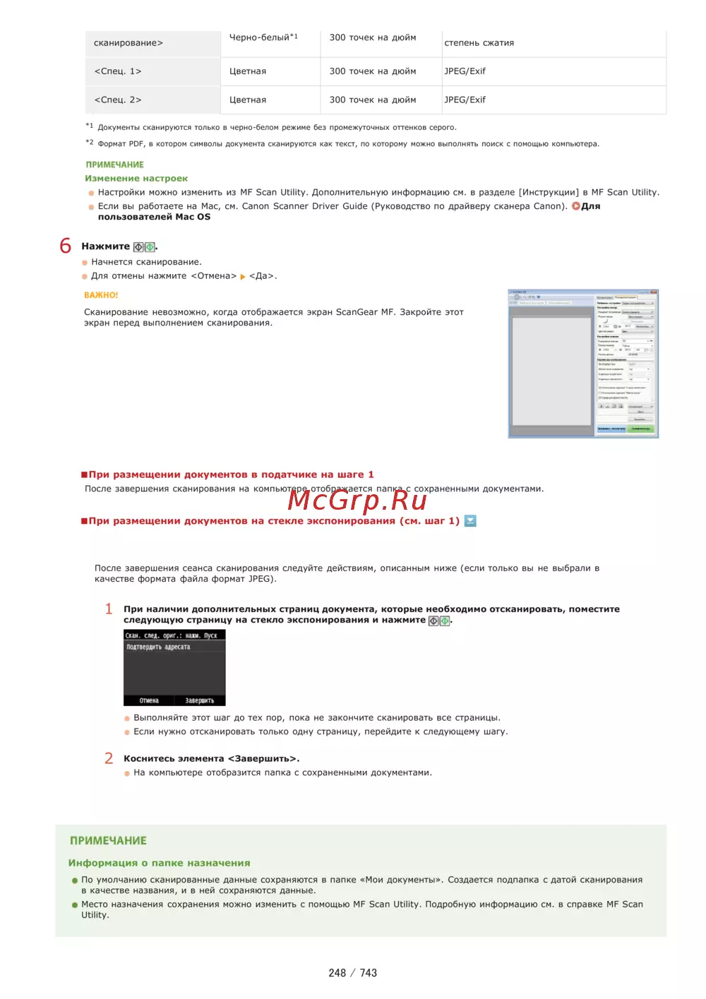 Черно белый 1 300 точек на дюйм сСпец 1 Цветная 300 точек на дюйм JPEG Exif сСпец 2 Цветная 300 точек на дюйм JPEG Exif сканирование 1 степень сжатия Документы сканируются только в черно белом режиме без промежуточных оттенков серого 2 Формат PDF в котором символы документа сканируются как текст по которому можно выполнять поиск с помощью компьютера ПРИМЕЧАНИЕ Изменение настроек Настройки можно изменить из MF Scan Utility Дополнительную информацию см в разделе Инструкции в MF Scan Utility Если вы работаете на Мас см Canon Scanner Driver Guide Руководство по драйверу сканера Canon Для пользователей Mac OS 0 Нажмите ф Ф Начнется сканирование Для отмены нажмите Отмена Да ВАЖНО Сканирование невозможно когда отображается экран ScanGear MF Закройте этот экран перед выполнением сканирования При размещении документов в податчике на шаге 1 После завершения сканирования на компьютере отображается папка с сохраненными документами При размещении документов на стекле экспонирования см шаг 1 в После завершения сеанса сканирования следуйте действиям описанным ниже если только вы не выбрали в качестве формата файла формат JPEG 1 При наличии дополнительных страниц документа которые необходимо отсканировать поместите следующую страницу на стекло экспонирования и нажмите ф ф Выполняйте этот шаг до тех пор пока не закончите сканировать все страницы Если нужно отсканировать только одну страницу перейдите к следующему шагу 2 Коснитесь элемента 3авершить На компьютере отобразится папка с сохраненными документами ПРИМЕЧАНИЕ Информация о папке назначения По умолчанию сканированные данные сохраняются в папке Мои документы Создается подпапка с датой сканирования в качестве названия и в ней сохраняются данные Место назначения сохранения можно изменить с помощью MF Scan Utility Подробную информацию см в справке MF Scan Utility 248 743