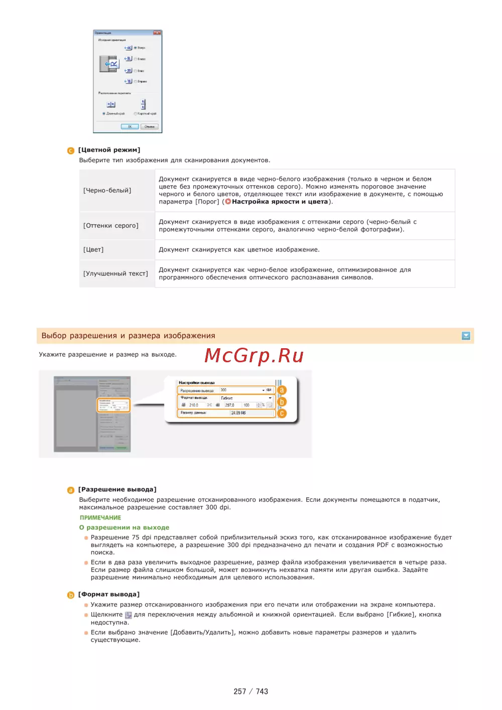 Цветной режим Выберите тип изображения для сканирования документов Черно белый Документ сканируется в виде черно белого изображения только в черном и белом цвете без промежуточных оттенков серого Можно изменять пороговое значение черного и белого цветов отделяющее текст или изображение в документе с помощью параметра Порог ОНастройка яркости и цвета Оттенки серого Документ сканируется в виде изображения с оттенками серого черно белый с промежуточными оттенками серого аналогично черно белой фотографии Цвет Документ сканируется как цветное изображение Улучшенный текст Документ сканируется как черно белое изображение оптимизированное для программного обеспечения оптического распознавания символов Выбор разрешения и размера изображения Укажите разрешение и размер на выходе g Разрешение вывода Выберите необходимое разрешение отсканированного изображения Если документы помещаются в податчик максимальное разрешение составляет 300 dpi ПРИМЕЧАНИЕ О разрешении на выходе Разрешение 75 dpi представляет собой приблизительный эскиз того как отсканированное изображение будет выглядеть на компьютере а разрешение 300 dpi предназначено дл печати и создания PDF с возможностью поиска Если в два раза увеличить выходное разрешение размер файла изображения увеличивается в четыре раза Если размер файла слишком большой может возникнуть нехватка памяти или другая ошибка Задайте разрешение минимально необходимым для целевого использования Формат вывода Укажите размер отсканированного изображения при его печати или отображении на экране компьютера Щелкните j для переключения между альбомной и книжной ориентацией Если выбрано Гибкие кнопка недоступна Если выбрано значение Добавить Удалить можно добавить новые параметры размеров и удалить существующие 257 743