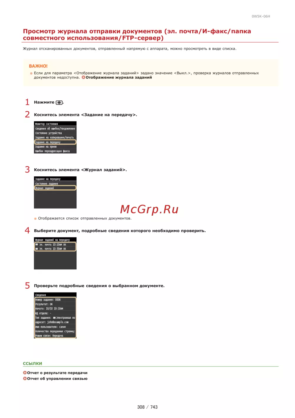 0W5K 06H Просмотр журнала отправки документов эл почта И факс папка совместного использования РТР сервер Журнал отсканированных документов отправленный напрямую с аппарата можно просмотреть в виде списка ВАЖНО Если для параметра Отображение журнала заданий задано значение Выкл проверка журналов отправленных документов недоступна Отображение журнала заданий Нажмите f 2 Коснитесь элемента 3адание на передачу 3 Коснитесь элемента Журнал заданий Отображается список отправленных документов 4 Выберите документ подробные сведения которого необходимо проверить 5 Проверьте подробные сведения о выбранном документе Сведения Номер задания 0096 Результат ок начато 10 10 1О 10АМ ИД отдела Тип задания электронная по Адресат johnSexaiple con Им пользователя canon количество переданньи страниц Режим связи передача ссылки ООтчет о результате передачи С Отчет об управлении связью 308 743