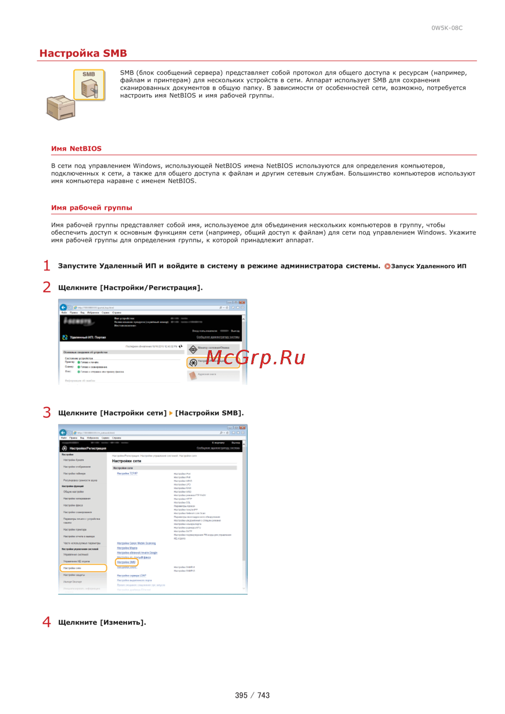 0W5K 08C Настройка SMB SMB блок сообщений сервера представляет собой протокол для общего доступа к ресурсам например файлам и принтерам для нескольких устройств в сети Аппарат использует SMB для сохранения сканированных документов в общую папку В зависимости от особенностей сети возможно потребуется настроить имя NetBIOS и имя рабочей группы Имя NetBIOS В сети под управлением Windows использующей NetBIOS имена NetBIOS используются для определения компьютеров подключенных к сети а также для общего доступа к файлам и другим сетевым службам Большинство компьютеров используют имя компьютера наравне с именем NetBIOS Имя рабочей группы Имя рабочей группы представляет собой имя используемое для объединения нескольких компьютеров в группу чтобы обеспечить доступ к основным функциям сети например общий доступ к файлам для сети под управлением Windows Укажите имя рабочей группы для определения группы к которой принадлежит аппарат 1 2 Запустите Удаленный ИП и войдите в систему в режиме администратора системы Запуск Удаленного ИП Щелкните Настройки Регистрация 3 Щелкните Настройки сети Настройки SMB 4 Щелкните Изменить 395 743