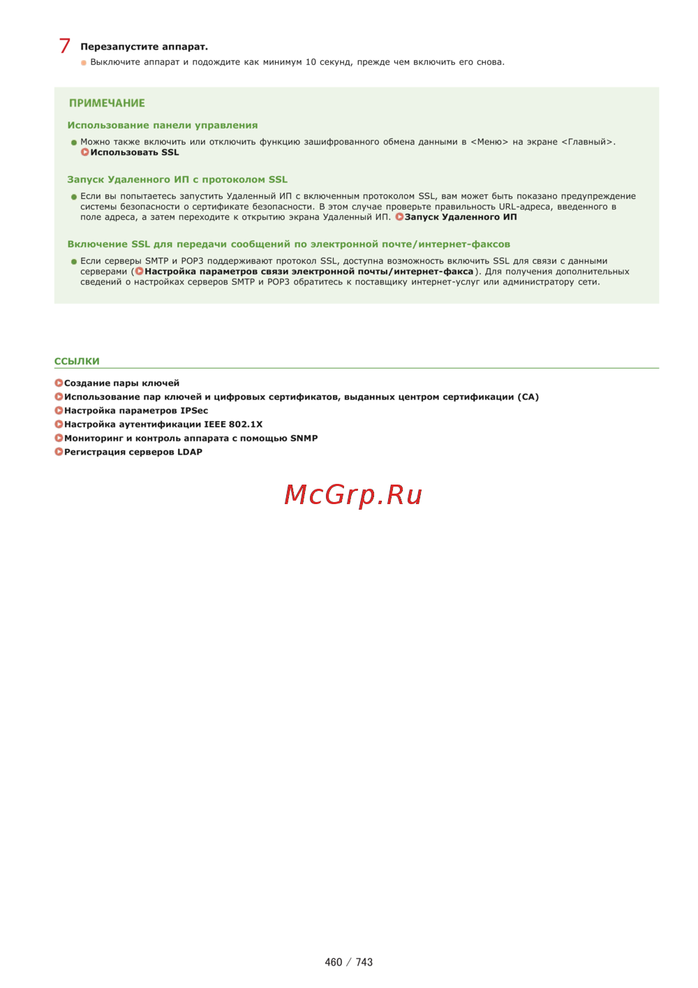 Перезапустите аппарат Выключите аппарат и подождите как минимум 10 секунд прежде чем включить его снова ПРИМЕЧАНИЕ Использование панели управления Можно также включить или отключить функцию зашифрованного обмена данными в Меню на экране Главный Использовать SSL Запуск Удаленного ИП с протоколом SSL Если вы попытаетесь запустить Удаленный ИП с включенным протоколом SSL вам может быть показано предупреждение системы безопасности о сертификате безопасности В этом случае проверьте правильность URL адреса введенного в поле адреса а затем переходите к открытию экрана Удаленный ИП СЗапуск Удаленного ИП Включение SSL для передачи сообщений по электронной почте интернет факсов Если серверы SMTP и POP3 поддерживают протокол SSL доступна возможность включить SSL для связи с данными серверами Настройка параметров связи электронной почты интернет факса Для получения дополнительных сведений о настройках серверов SMTP и POP3 обратитесь к поставщику интернет услуг или администратору сети ССЫЛКИ Создание пары ключей Использование пар ключей и цифровых сертификатов выданных центром сертификации СА Настройка параметров IPSec Настройка аутентификации IEEE 802 IX О Мониторинг и контроль аппарата с помощью SNMP Регистрация серверов LDAP 460 743