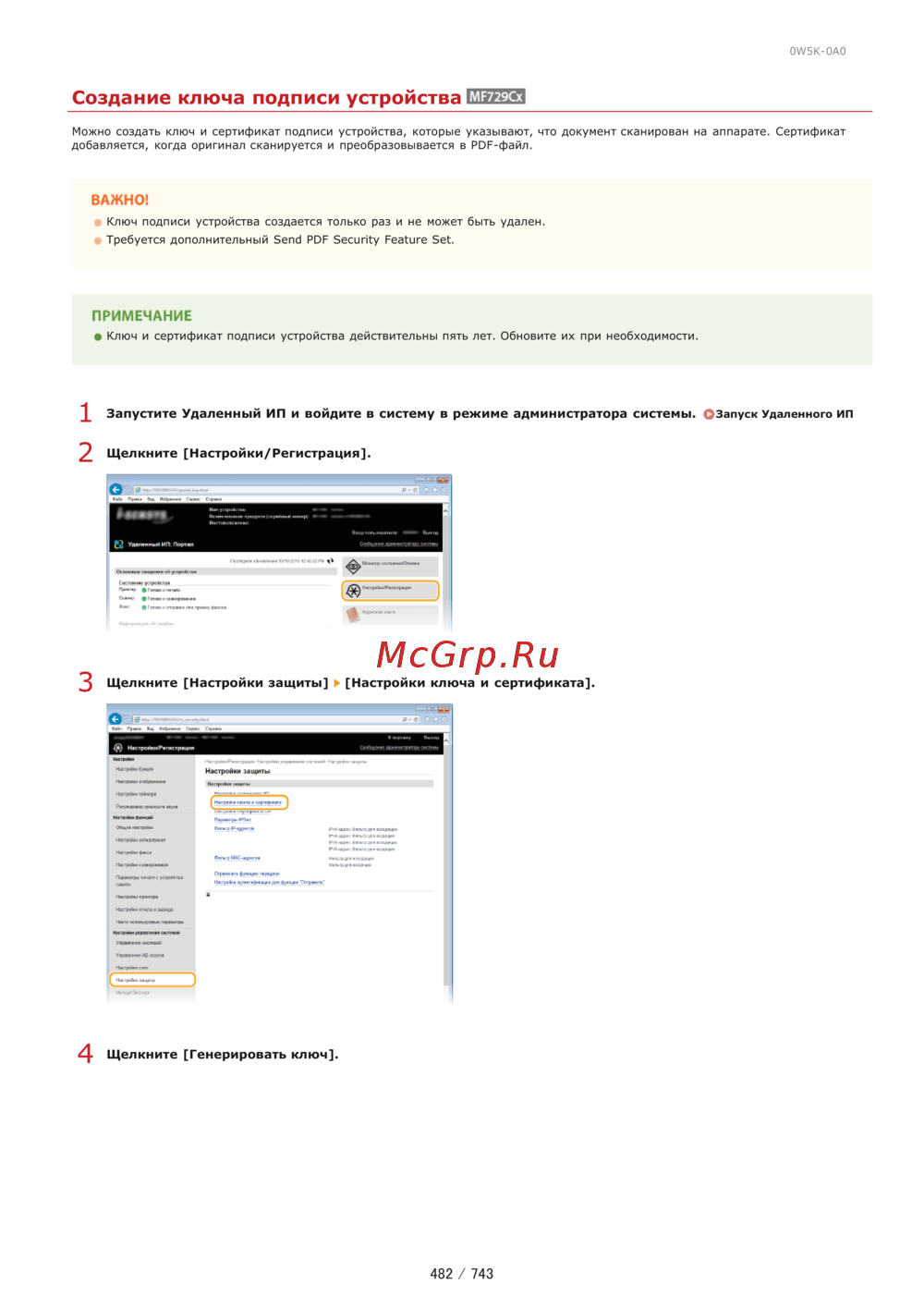 0W5K 0A0 Создание ключа подписи устройства MF729CX Можно создать ключ и сертификат подписи устройства которые указывают что документ сканирован на аппарате Сертификат добавляется когда оригинал сканируется и преобразовывается в РОГ файл ВАЖНО Ключ подписи устройства создается только раз и не может быть удален Требуется дополнительный Send PDF Security Feature Set ПРИМЕЧАНИЕ Ключ и сертификат подписи устройства действительны пять лет Обновите их при необходимости Запустите Удаленный ИП и войдите в систему в режиме администратора системы ОЗапуск Удаленного ИП 2 Щелкните Настройки Регистрация 3 Щелкните Настройки защиты Настройки ключа и сертификата 4 Щелкните Генерировать ключ 482 743