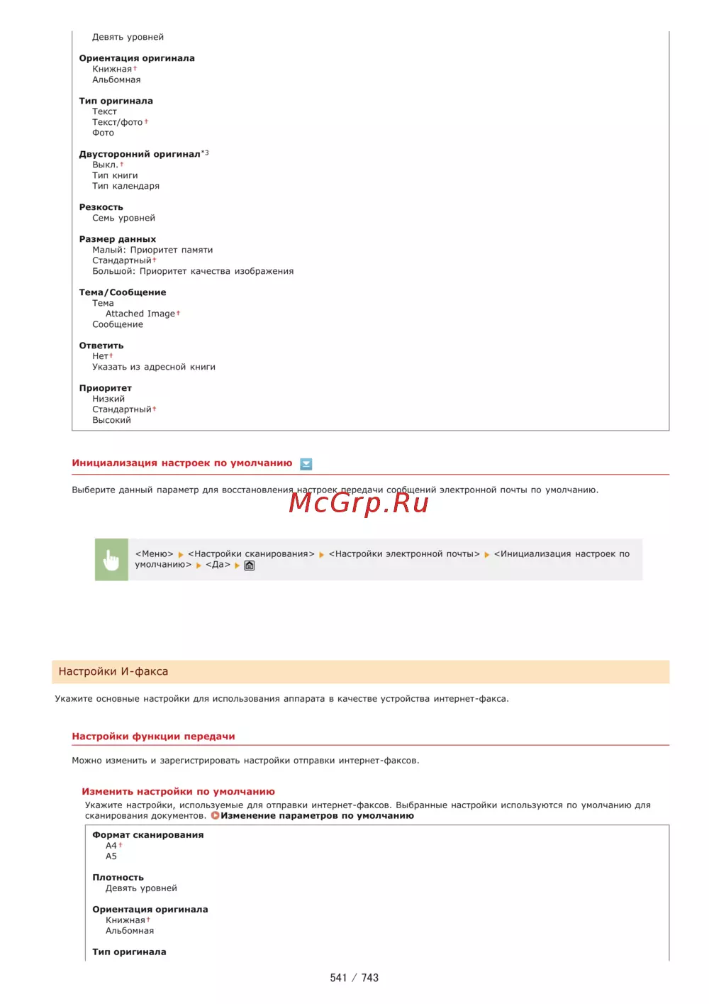 Девять уровней Ориентация оригинала Книжная Альбомная Тип оригинала Текст Текст фото Фото Двусторонний оригинал 3 Выкл Тип книги Тип календаря Резкость Семь уровней Размер данных Малый Приоритет памяти Стандартный Большой Приоритет качества изображения Тема Сообщение Тема Attached Image t Сообщение Ответить Нет1 Указать из адресной книги Приоритет Низкий Стандартный Высокий Инициализация настроек по умолчанию Выберите данный параметр для восстановления настроек передачи сообщений электронной почты по умолчанию Меню Настройки сканирования к сНастройки электронной почты Инициализация настроек по умолчанию к Да Настройки И факса Укажите основные настройки для использования аппарата в качестве устройства интернет факса Настройки функции передачи Можно изменить и зарегистрировать настройки отправки интернет факсов Изменить настройки по умолчанию Укажите настройки используемые для отправки интернет факсов Выбранные настройки используются по умолчанию для сканирования документов ОИзменение параметров по умолчанию Формат сканирования A4t А5 Плотность Девять уровней Ориентация оригинала Книжная1 Альбомная Тип оригинала 541 743