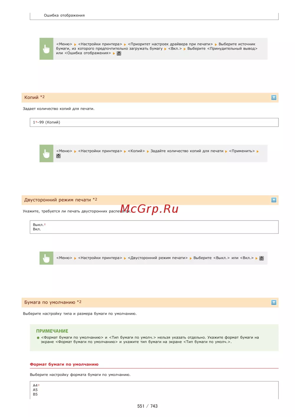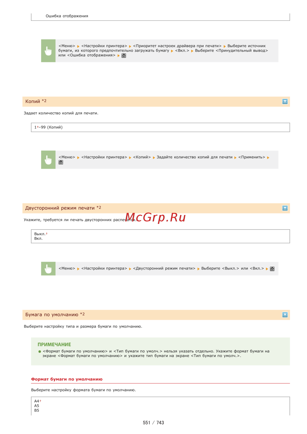 I 1 Ошибка отображения Меню Настройки принтера Приоритет настроек драйвера при печати Выберите источник бумаги из которого предпочтительно загружать бумагу Вкл Выберите Принудительный вывод или Ошибка отображения Щ ы Копий 2 Задает количество копий для печати 1 99 Копий Меню Настройки принтера Копий г Задайте количество копий для печати Применить Двусторонний режим печати 2 Укажите требуется ли печать двусторонних распечаток ВыклЛ Вкл Меню Настройки принтера Двусторонний режим печати Выберите Выкл или Вкл Бумага по умолчанию 2 Выберите настройку типа и размера бумаги по умолчанию ПРИМЕЧАНИЕ Формат бумаги по умолчанию и Тип бумаги по умолч нельзя указать отдельно Укажите формат бумаги на экране Формат бумаги по умолчанию и укажите тип бумаги на экране Тип бумаги по умолч Формат бумаги по умолчанию Выберите настройку формата бумаги по умолчанию А41 А5 В5 551 743