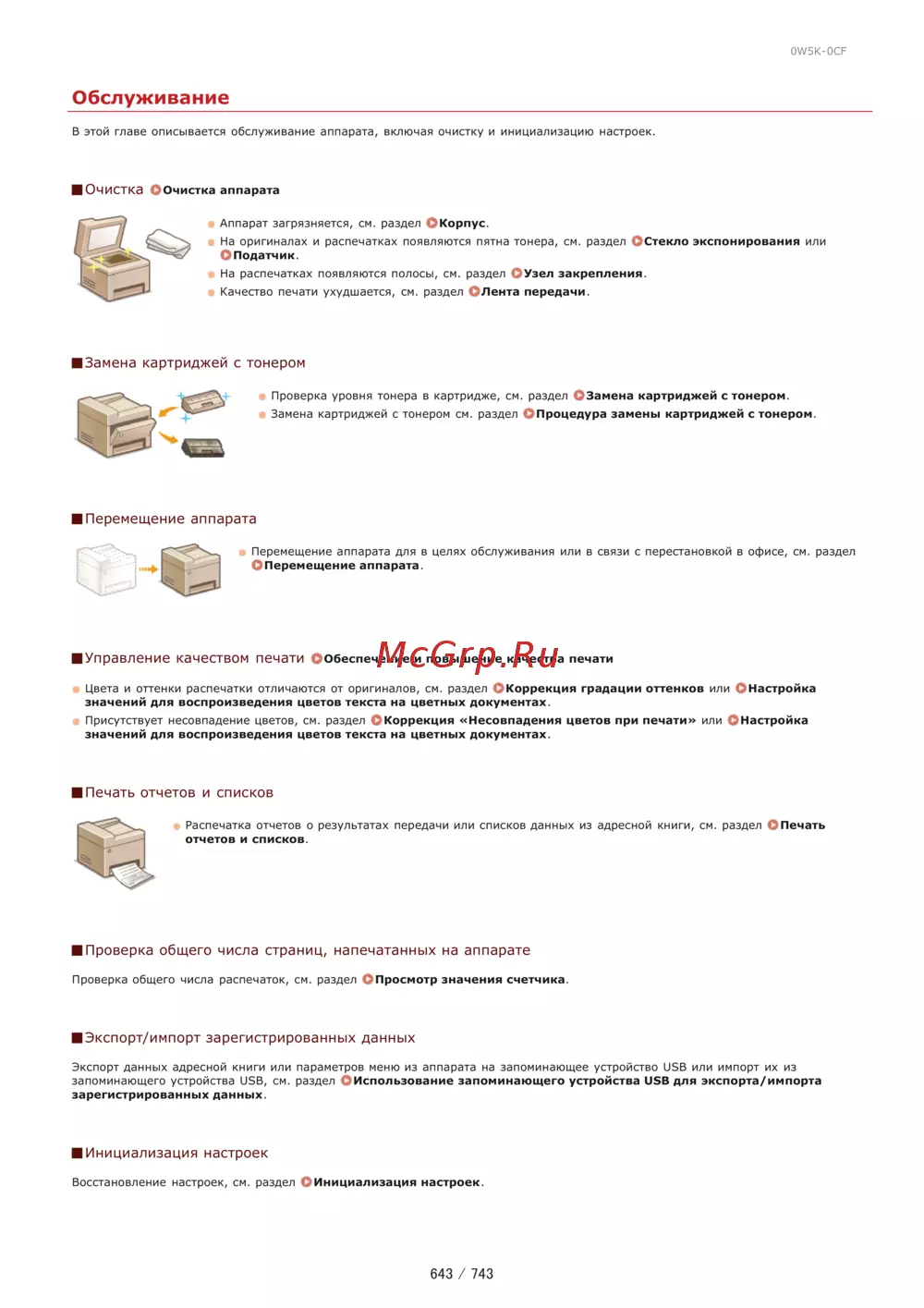 0W5K 0CF Обслуживание В этой главе описывается обслуживание аппарата включая очистку и инициализацию настроек Очистка Очистка аппарата Аппарат загрязняется см раздел Корпус На оригиналах и распечатках появляются пятна тонера см раздел Стекло экспонирования или С Податчик На распечатках появляются полосы см раздел Узел закрепления Качество печати ухудшается см раздел Лента передачи Замена картриджей с тонером Проверка уровня тонера в картридже см раздел Замена картриджей стонером Замена картриджей с тонером см раздел Процедура замены картриджей с тонером Перемещение аппарата Перемещение аппарата для в целях обслуживания или в связи с перестановкой в офисе см раздел Перемещение аппарата Управление качеством печати Обеспечение и повышение качества печати Цвета и оттенки распечатки отличаются от оригиналов см раздел Коррекция градации оттенков или Настройка значений для воспроизведения цветов текста на цветных документах Присутствует несовпадение цветов см раздел Коррекция Несовпадения цветов при печати или Настройка значений для воспроизведения цветов текста на цветных документах Печать отчетов и списков Распечатка отчетов о результатах передачи или списков данных из адресной книги см раздел Печать отчетов и списков Проверка общего числа страниц напечатанных на аппарате Проверка общего числа распечаток см раздел Просмотр значения счетчика Экспорт импорт зарегистрированных данных Экспорт данных адресной книги или параметров меню из аппарата на запоминающее устройство USB или импорт их из запоминающего устройства USB см раздел Использование запоминающего устройства USB для экспорта импорта зарегистрированных данных Инициализация настроек Восстановление настроек см раздел Инициализация настроек 643 743