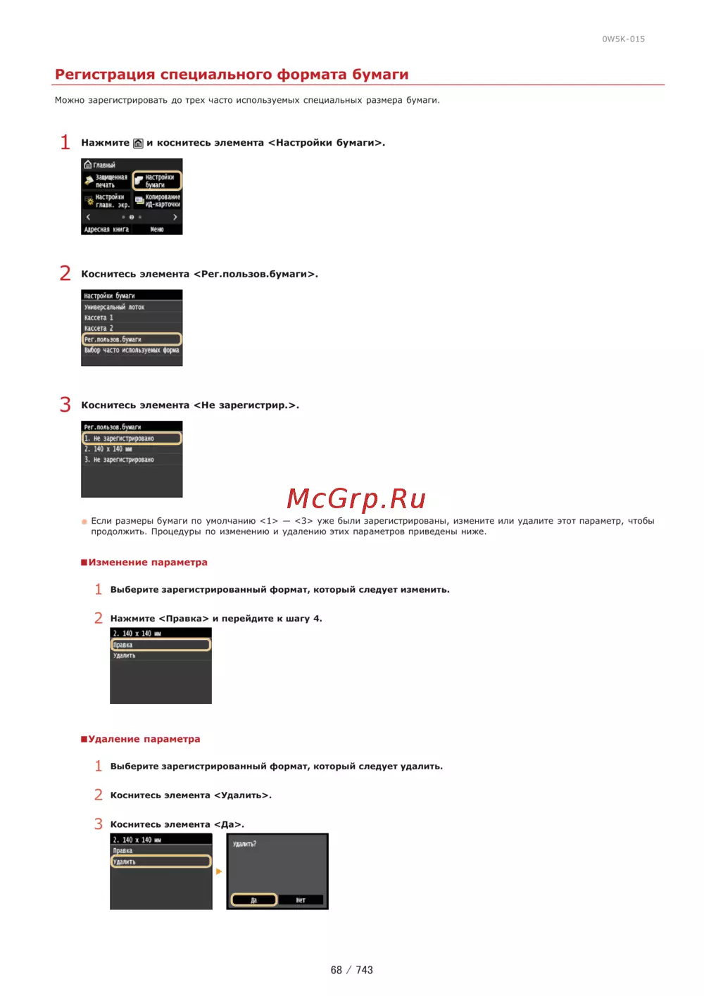 0W5K 015 Регистрация специального формата бумаги Можно зарегистрировать до трех часто используемых специальных размера бумаги 1 Нажмите Щ и коснитесь элемента Настройки бумаги 0 главный ь зааииенная ____ 1 печать 1 настройки Ш копирование КД ка точки главк экр 9 Адресная книга меню 2 Коснитесь элемента Рег пользов бумаги 3 Коснитесь элемента Не зарегистрир Рег польэдв буиаги 2 140 х 140 3 не зарегистрировано Если размеры бумаги по умолчанию 1 3 уже были зарегистрированы измените или удалите этот параметр чтобы продолжить Процедуры по изменению и удалению этих параметров приведены ниже Изменение параметра X Выберите зарегистрированный формат который следует изменить 2 Нажмите Правка и перейдите к шагу 4 Удаление параметра Выберите зарегистрированный формат который следует удалить 2 Коснитесь элемента Удалить 3 Коснитесь элемента Да 68 743