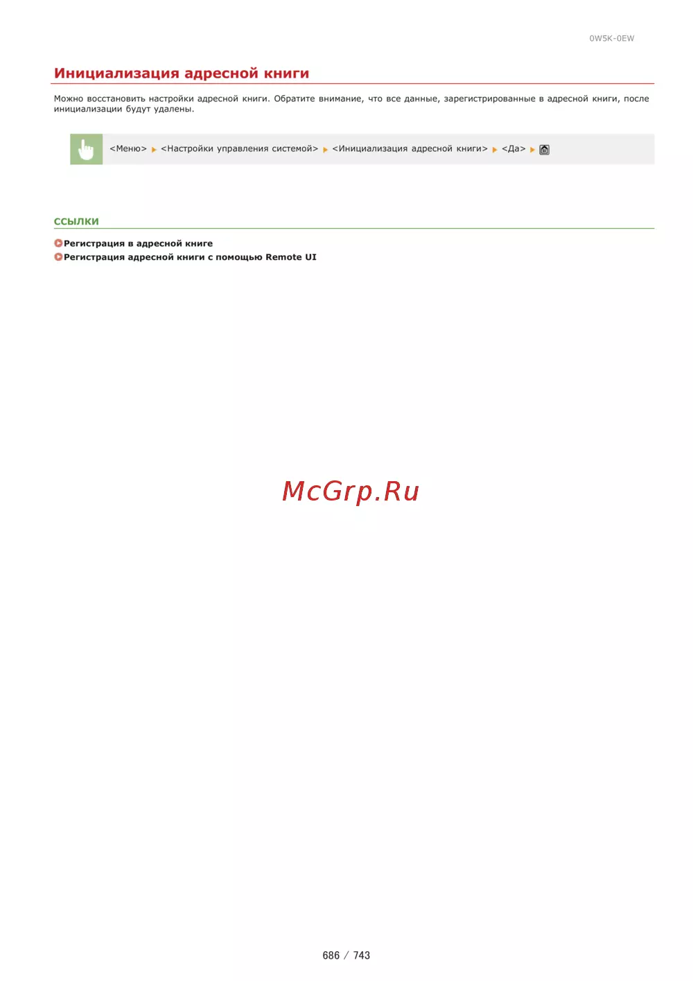0W5K 0EW Инициализация адресной книги Можно восстановить настройки адресной книги Обратите внимание что все данные зарегистрированные в адресной книги после инициализации будут удалены Меню Настройки управления системой Инициализация адресной книги и Да jjji ССЫЛКИ О Регистрация в адресной книге СРегистрация адресной книги с помощью Remote UI 686 743