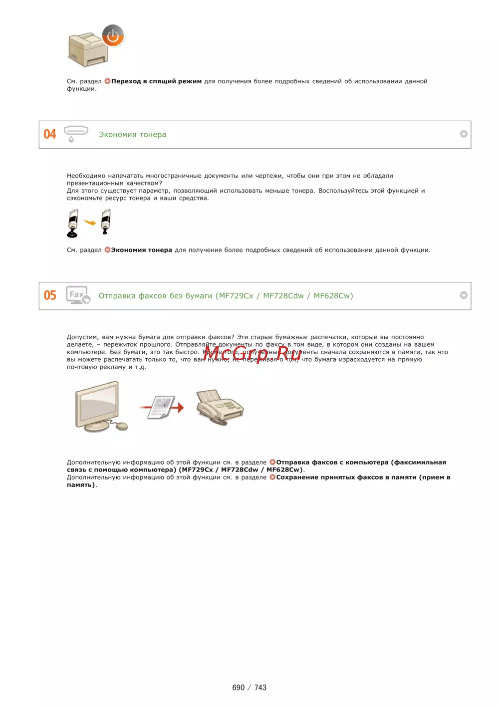 См раздел О Переход в спящий режим для получения более подробных сведений об использовании данной функции Экономия тонера Необходимо напечатать многостраничные документы или чертежи чтобы они при этом не обладали презентационным качеством Для этого существует параметр позволяющий использовать меньше тонера Воспользуйтесь этой функцией и сэкономьте ресурс тонера и ваши средства См раздел Сэкономил тонера для получения более подробных сведений об использовании данной функции Отправка факсов без бумаги МР729Сх МР728СС1УУ МР628СУУ Допустим вам нужна бумага для отправки факсов Эти старые бумажные распечатки которые вы постоянно делаете пережиток прошлого Отправляйте документы по факсу в том виде в котором они созданы на вашем компьютере Без бумаги это так быстро Кроме того полученные документы сначала сохраняются в памяти так что вы можете распечатать только то что вам нужно не переживая о том что бумага израсходуется на прямую почтовую рекламу и т д Дополнительную информацию об этой функции см в разделе Отправка факсов с компьютера факсимильная связь с помощью компьютера МБ729Сх МР728Сйш MFб28Cw Дополнительную информацию об этой функции см в разделе Сохранение принятых факсов в памяти прием в память 690 743