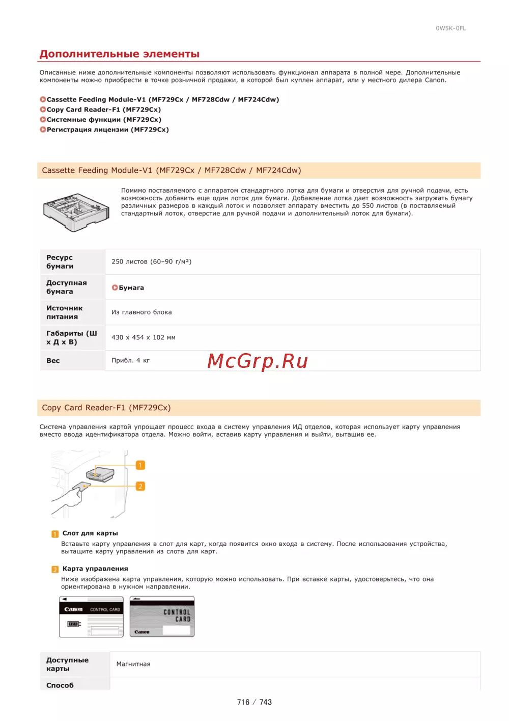 0W5K 0FL Дополнительные элементы Описанные ниже дополнительные компоненты позволяют использовать функционал аппарата в полной мере Дополнительные компоненты можно приобрести в точке розничной продажи в которой был куплен аппарат или у местного дилера Canon Cassette Feeding Module Vl MF729CX MF728Cdw MF724Cdw Copy Card Reader Fl MF729Cx Системные функции MF729Cx Регистрация лицензии MF729Cx Cassette Feeding Module Vl MF729CX MF728Cdw MF724Cdw Помимо поставляемого с аппаратом стандартного лотка для бумаги и отверстия для ручной подачи есть возможность добавить еще один лоток для бумаги Добавление лотка дает возможность загружать бумагу различных размеров в каждый лоток и позволяет аппарату вместить до 550 листов в поставляемый стандартный лоток отверстие для ручной подачи и дополнительный лоток для бумаги Ресурс бумаги 250 листов 60 90 г м2 Доступная бумага Бумага Источник питания Из главного блока Габариты Ш х Д х В 430 х 454 х 102 мм Вес Прибл 4 кг Copy Card Reader Fl MF729Cx Система управления картой упрощает процесс входа в систему управления ИД отделов которая использует карту управления вместо ввода идентификатора отдела Можно войти вставив карту управления и выйти вытащив ее Слот для карты Вставьте карту управления в слот для карт когда появится окно входа в систему После использования устройства вытащите карту управления из слота для карт Карта управления Ниже изображена карта управления которую можно использовать При вставке карты удостоверьтесь что она ориентирована в нужном направлении Доступные карты Магнитная Способ 716 743