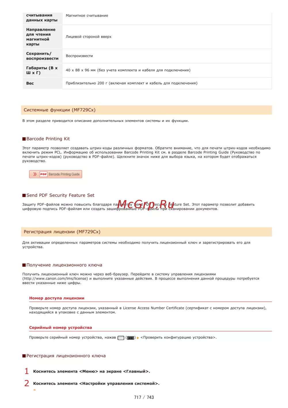 считывания данных карты Магнитное считывание Направление для чтения магнитной карты Лицевой стороной вверх Сохранить воспроизвести Воспроизвести Габариты В х Ш х Г 40 х 88 х 96 мм без учета комплекта и кабеля для подключения Вес Приблизительно 200 г включая комплект и кабель для подключения Системные функции МР729Сх В этом разделе приводится описание дополнительных элементов системы и их функции Barcode Printing Kit Этот параметр позволяет создавать штрих коды различных форматов Обратите внимание что для печати штрих кодов необходимо включить режим PCL Информацию об использовании Barcode Printing Kit см в разделе Barcode Printing Guide Руководство по печати штрих кодов руководство в PDF файле Щелкните значок ниже для выбора языка на котором будет отображаться руководство р D г Ba rcode Print ng G u ide Send PDF Security Feature Set Защиту PDF файлов можно повысить благодаря параметру Send PDF Security Feature Set Этот параметр позволит добавить цифровую подпись PDF файлам или создать зашифрованные PDF файлы при сканировании документов Регистрация лицензии МР729Сх Для активации определенных параметров системы необходимо получить лицензионный ключ и зарегистрировать его для устройства Получение лицензионного ключа Получить лицензионный ключ можно через веб браузер Перейдите в систему управления лицензиями http www canon com lms license и выполните указанные действия В процессе выполнения данной процедуры потребуется ввести указанные ниже цифры Номер доступа лицензии Проверьте номер доступа лицензии указанный в License Access Number Certificate сертификат с номером доступа лицензии находящийся в упаковке с данным элементом Серийный номер устройства Проверьте серийный номер устройства нажав тр Проверить конфигурацию устройствах Регистрация лицензионного ключа Коснитесь элемента Меню на экране Главный 2 Коснитесь элемента Настройки управления системой 717 743