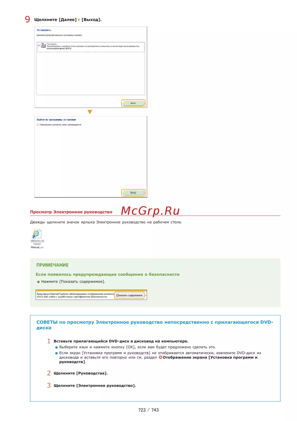У Щелкните Далее Выход УС1Ш ОВМ1Ь шег ле щен дои в дани из гсоюиш ви Выитм из программы установки г теяипа е идагъигер ас ие 01 п 1 Просмотр Электронное руководство Дважды щелкните значок ярлыка Электронное руководство на рабочем столе ПРИМЕЧАНИЕ Если появилось предупреждающее сообщение о безопасности Нажмите Показать содержимое Браузером Гп1етпе Е р1огег заблокировано отображение контента тоге веб сайте с ошибочным сертификатом опасности оказать содержимое СОВЕТЫ по просмотру Электронное руководство непосредственно с прилагающегося 070диска _ Вставьте прилагающийся ОУО диск в дисковод на компьютере Выберите язык и нажмите кнопку ОК если вам будет предложено сделать это Если экран Установка программ и руководств не отображается автоматически извлеките Р Р диск из дисковода и вставьте его повторно или см раздел О Отображение экрана Установка программ и руководств 2 Щелкните Руководства 3 Щелкните Электронное руководство 723 743